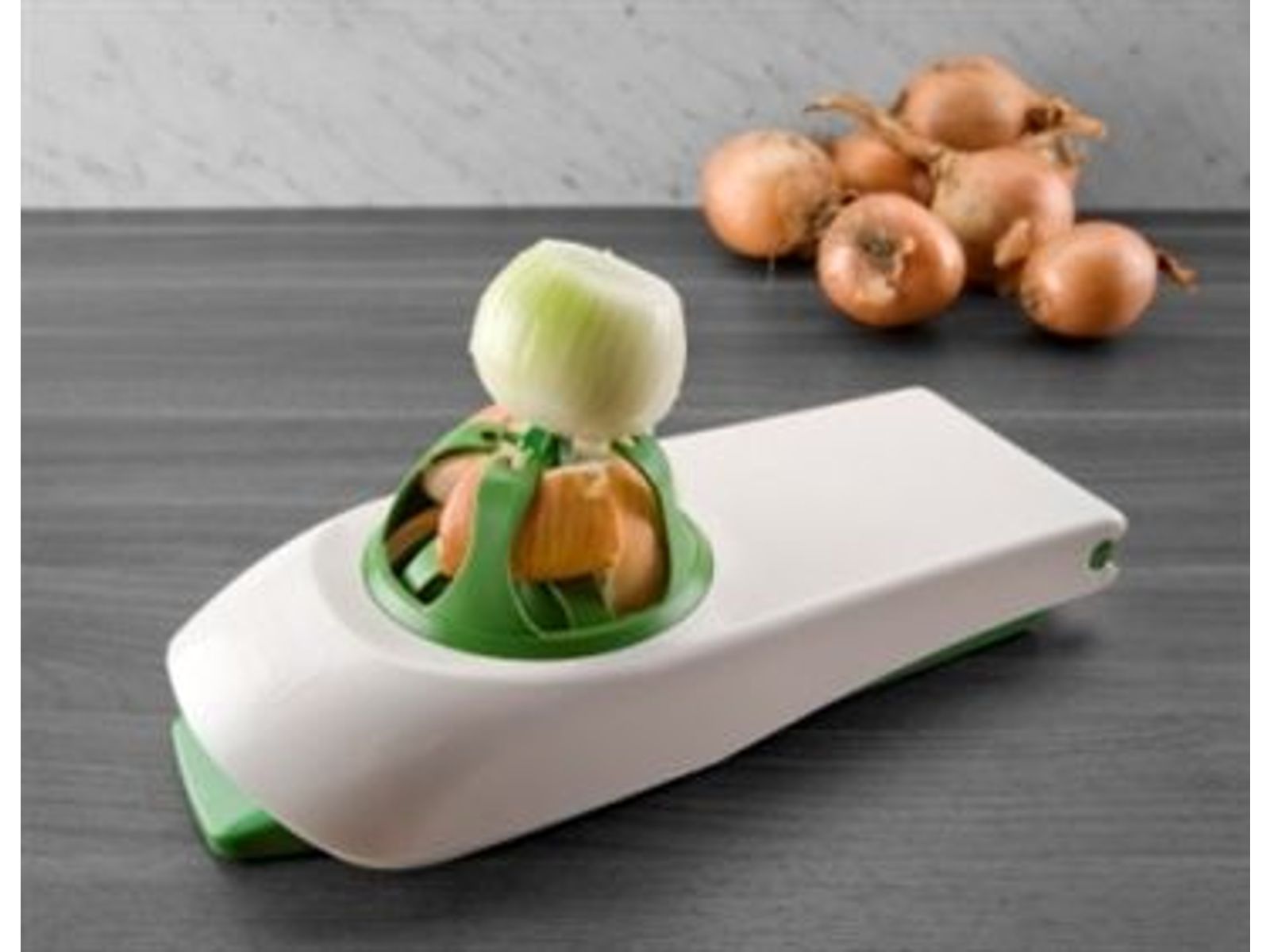 De Alligator Peeler is speciaal ontworpen om uien zonder veel moeite en veilig te pellen. Snij de uiteinden van de ui en plaats de ui op het toestel. Sluit de Alligator Peeler en de schil is verwijderd!