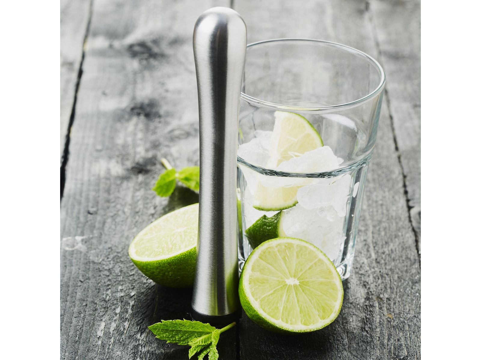 Snijd de halve limoen in zes stukken en doe ze samen met de muntblaadjes in het collinsglas. Bestrooi met de rietsuiker en kras de suiker lichtjes in de blaadjes met behulp van de professionele cocktailstamper. Vul het glas op met gepileerd ijs en voeg daar de rum aan toe. Roer alles goed om met sodawater. Decoreer met twee munttakjes en serveer met een rietje. Proost! Afmetingen: Ø 2.5cm H 18cm |