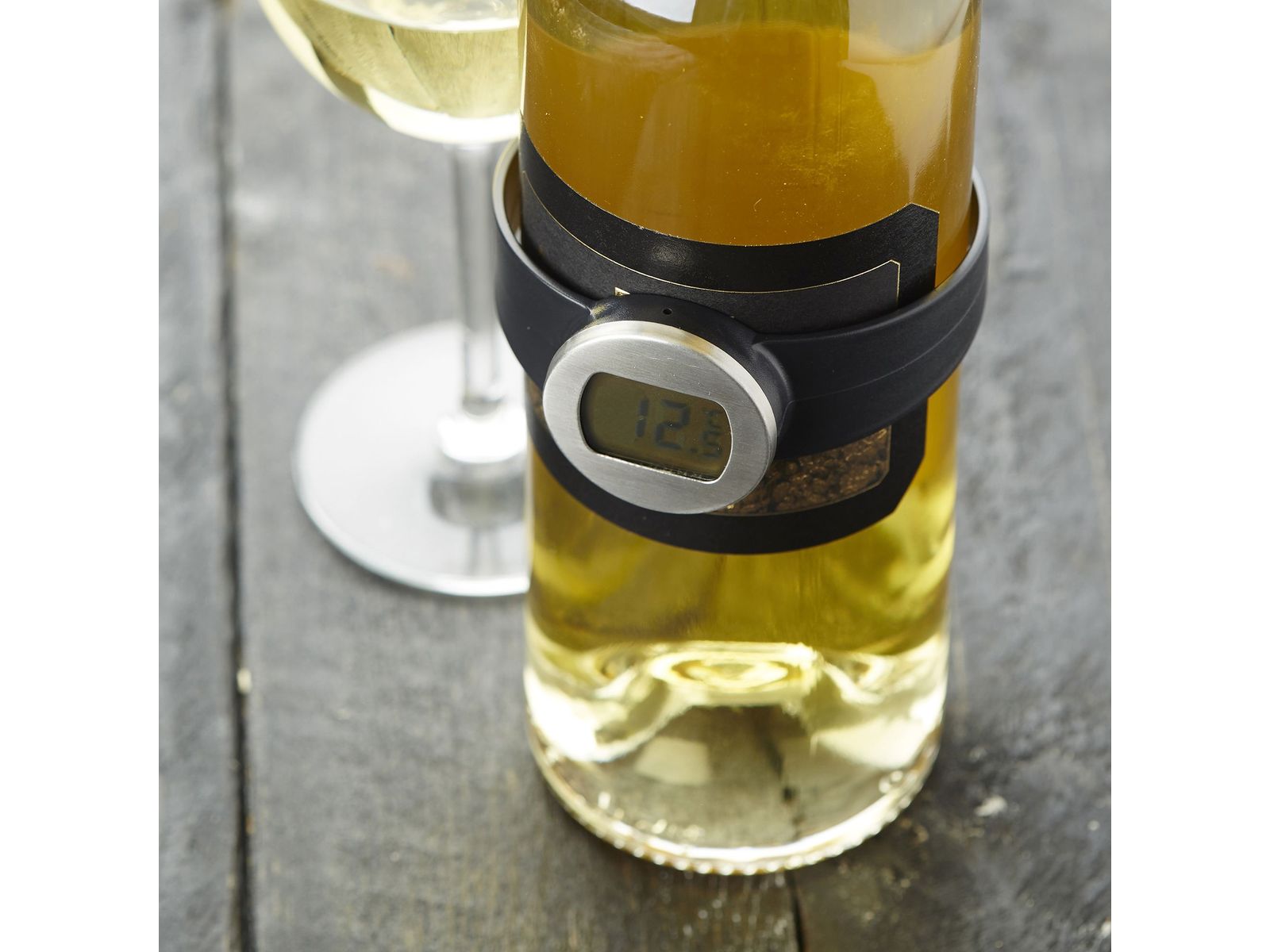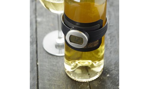 Plaats de thermometer op de romp van de fles en lees op het digitale scherm welke temperatuur deze heeft.