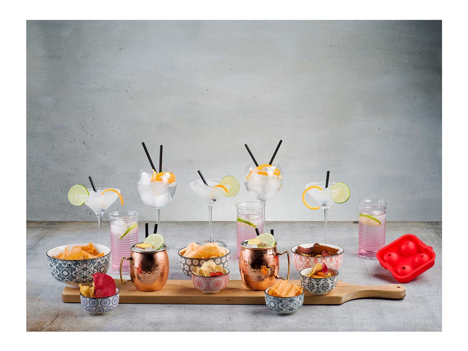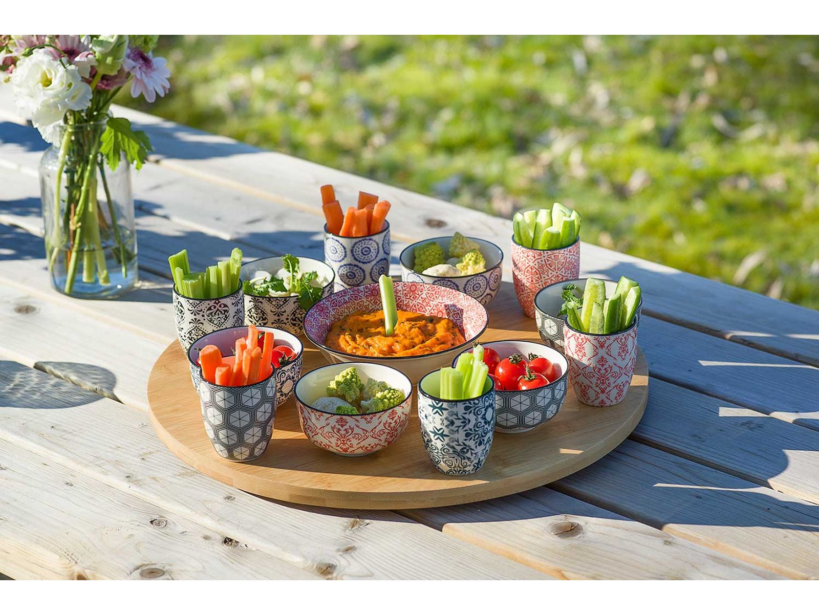 Bij het aperitief met partysnacks en dipsauzen zullen gasten aan Delirio met micromotieven plezier beleven. Ook bij gourmet, wanneer de bekers en schaaltjes met groentenreepjes en blokjes vlees op de draaischotel in het midden van de tafel gepresenteerd worden. Of vul de schaaltjes en bekers met toppings zoals discobolletjes, brésiliennenootjes, caramelsaus. Vervaardigd uit aardewerk.