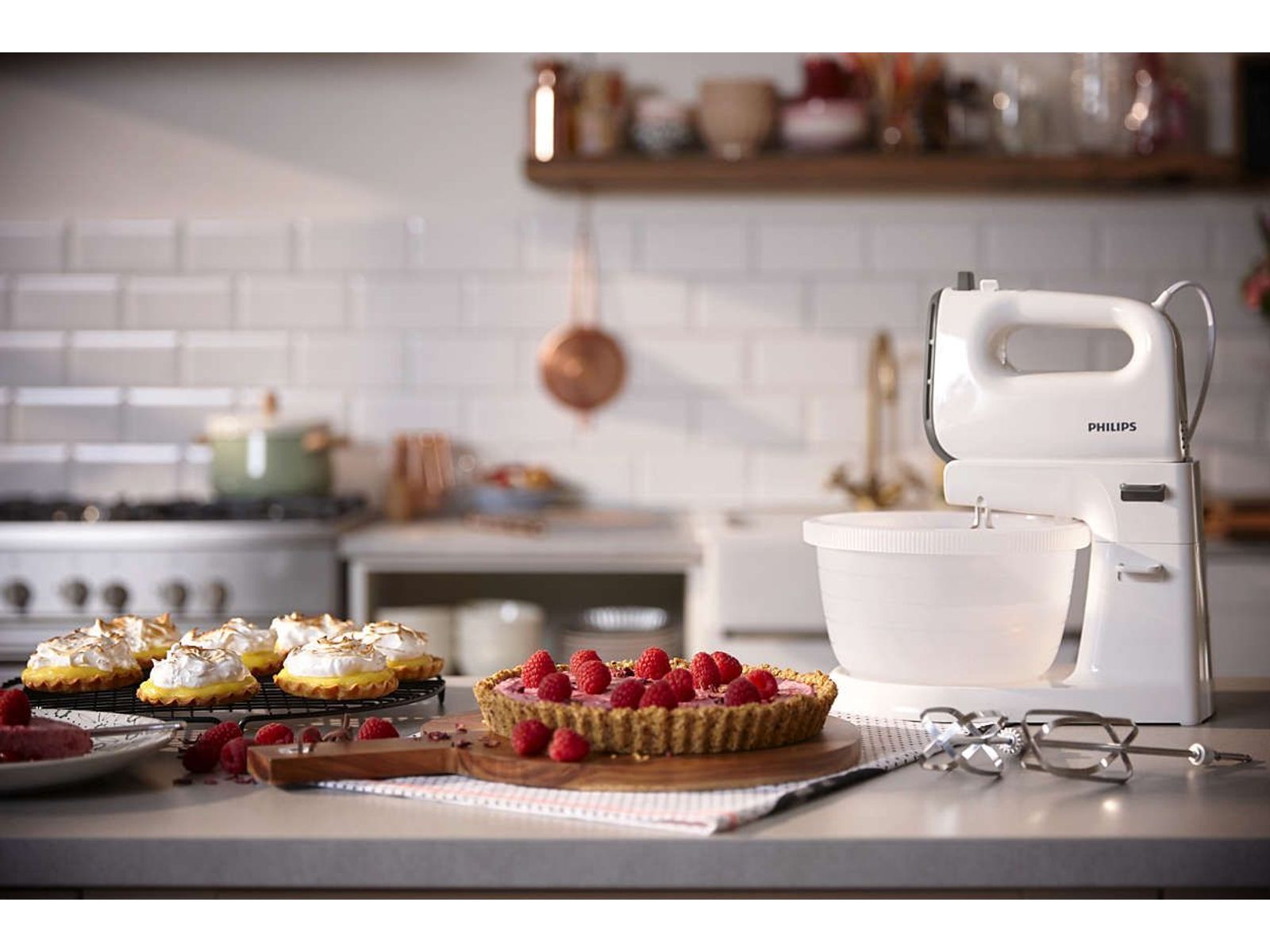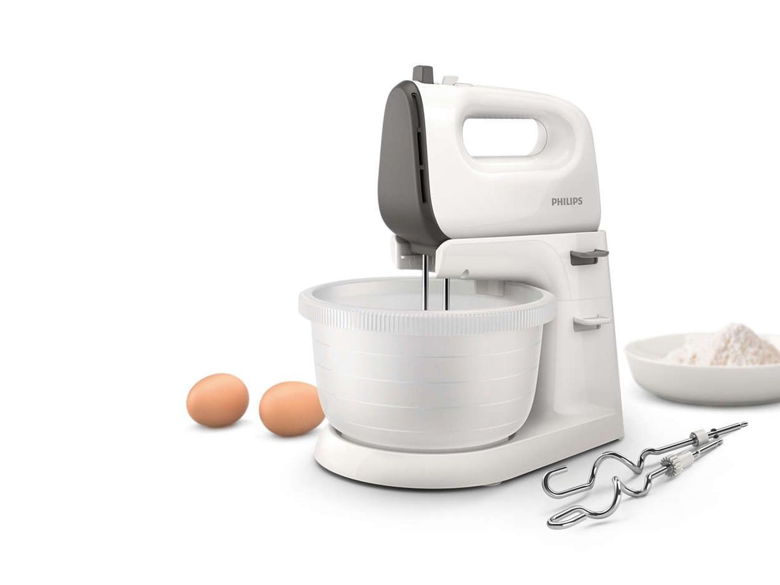 Met de Philips-mixer maakt u heerlijke luchtige cakes en brood voor uw gezin. Luchtige, kegelvormige kloppers zorgen voor kortere kloptijd en glad cakebeslag. Met de krachtige motor van 450 W komt u moeiteloos door het taaiste deeg.