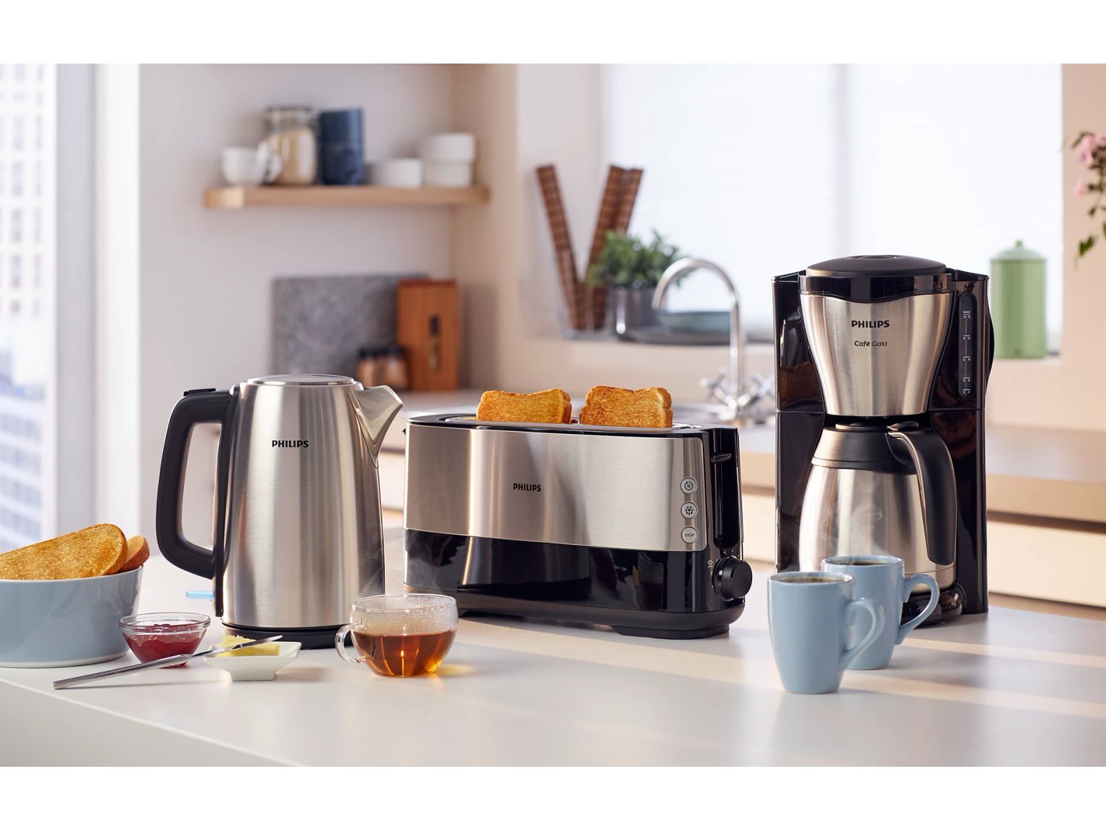 Duurzame waterkoker van voedselveilig volledig roestvrij staal voor langdurig en betrouwbaar gebruik, dag na dag. Deze elegante en duurzame Philips-waterkoker is gemaakt met meer dan 60 jaar beproefde ervaring.