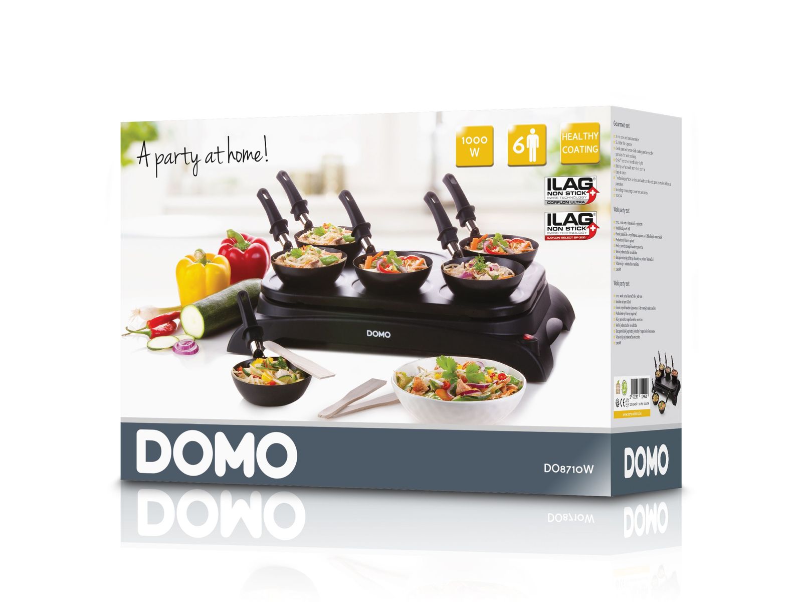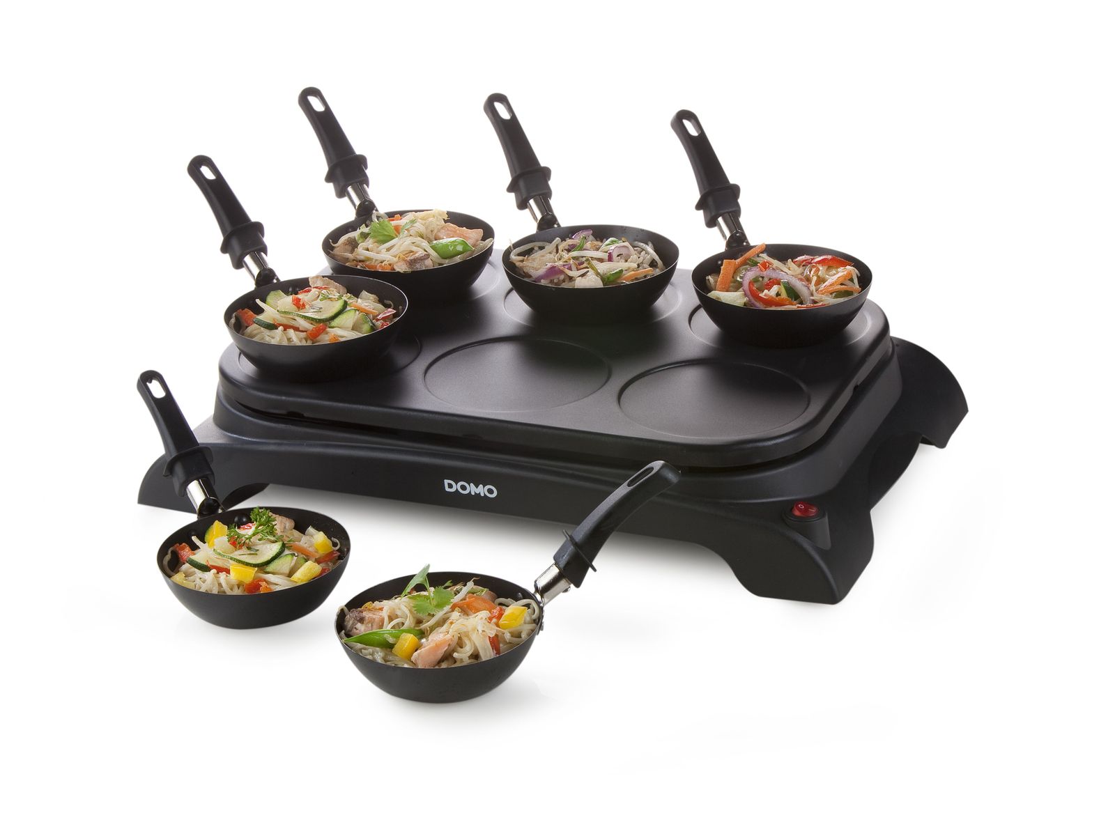 2-in-1: wok en pannenkoekenplaat - Geschikt voor 6 personen - 6 wokpannetjes met antiaanbaklaag en 6 houten spatels om gezellig samen te wokken - Aan/uitschakelaar met indicatielampje - Bakplaat met hoogwaardige antiaanbaklaag - Makkelijk schoon te maken - Ook zonder wokpannetjes te gebruiken voor pannenkoekjes - Inclusief pollepel voor pannenkoeken - 1000 W