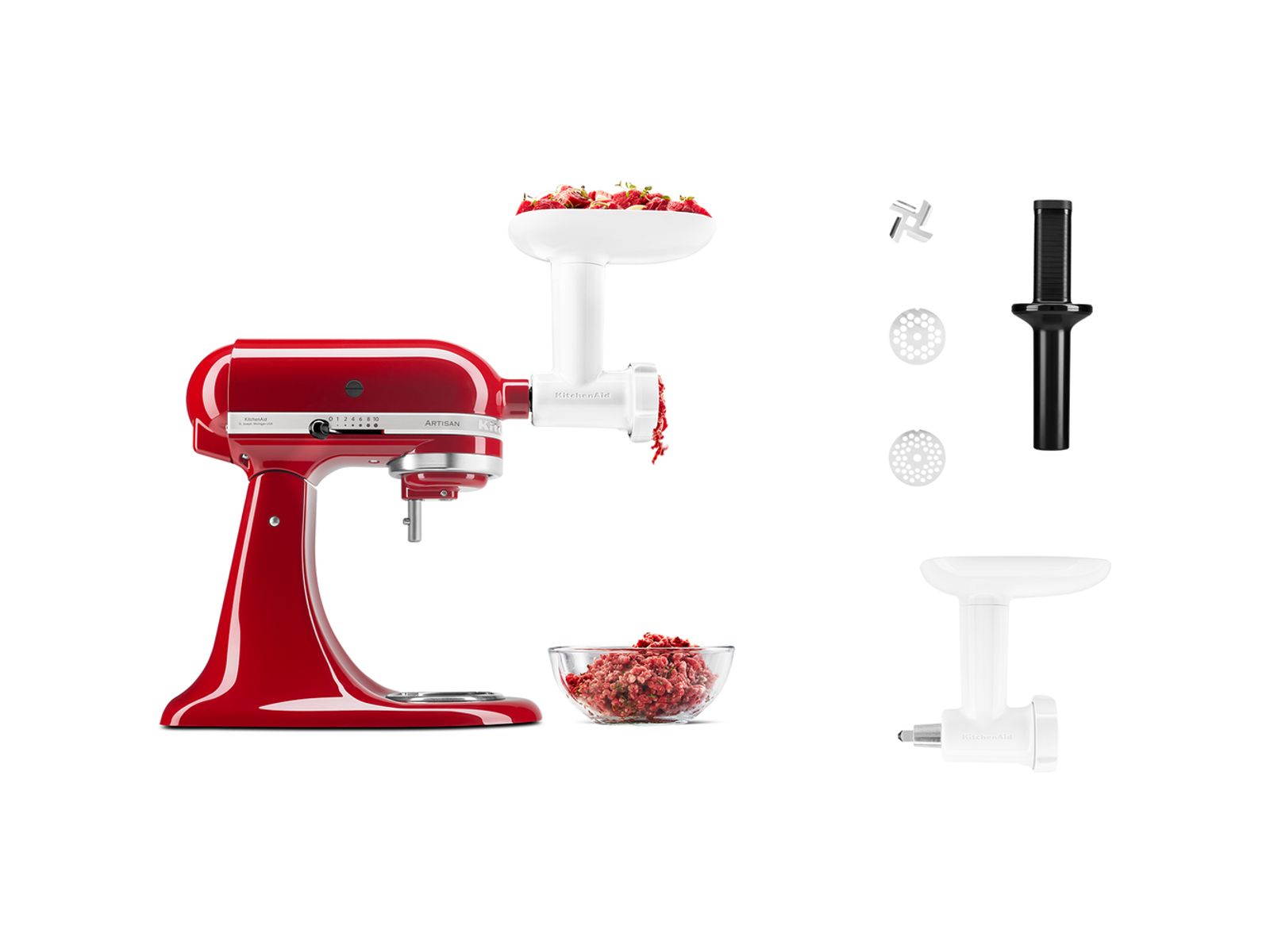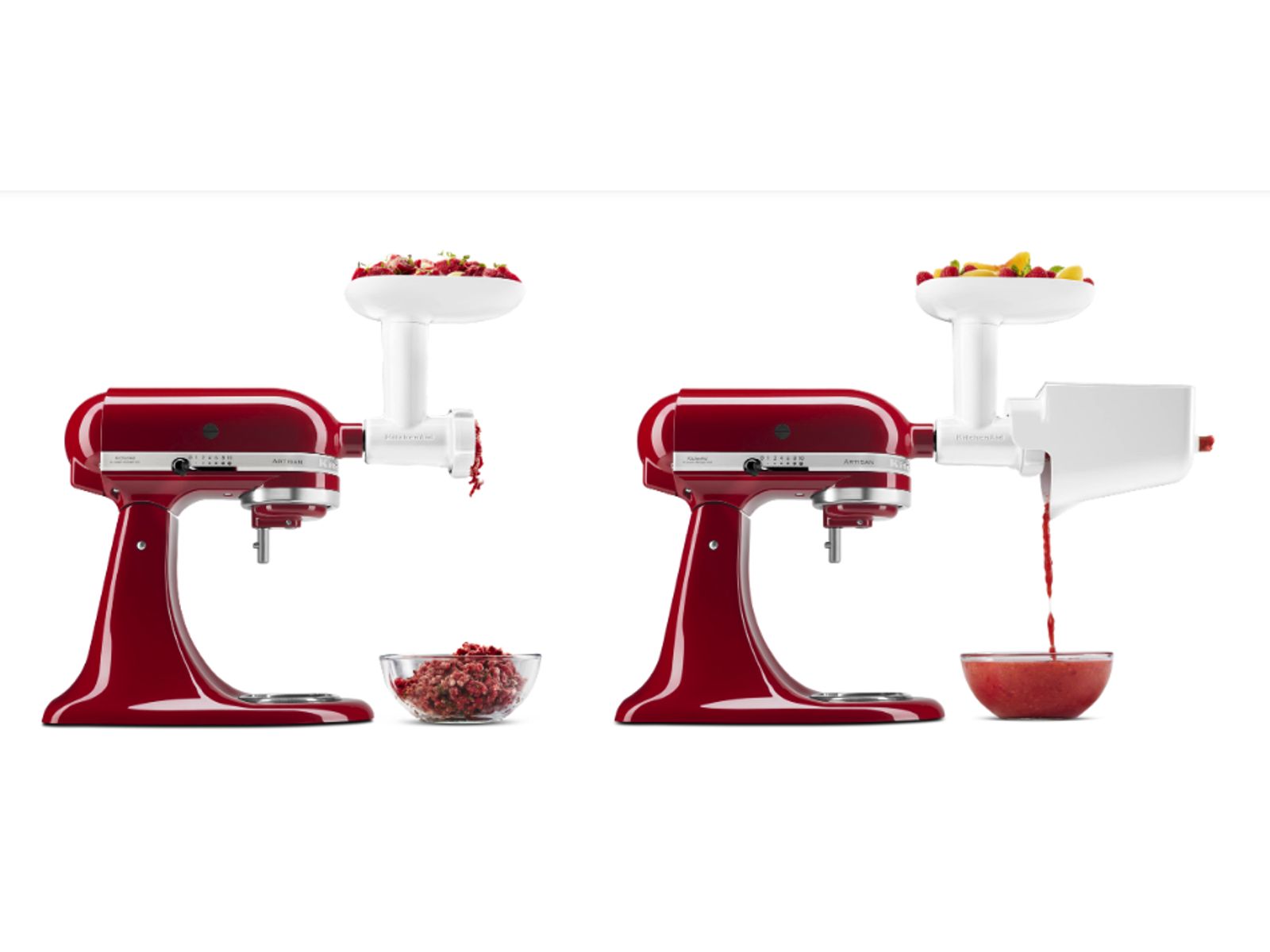 Met deze handige set accessoires voor de KitchenAid mixers/keukenrobots maak je gezonde en creatieve gerechten van verse, pure ingrediënten. Hiermee heb je alles wat je nodig hebt om rauw vlees en vis, groente, harde kazen en fruit te verwerken en burgers, jam, salsa, sauzen, babyvoeding en meer te maken. Met de fijne en grove maalschijven van de KitchenAid voedselmolen transformeer je ingrediënten in razend tempo. Gebruik de stamper om het voedsel veilig naar het mes en de schijven te duwen. De fruit- en groentezeef van KitchenAid kun je met de voedselmolen combineren om schillen en pitten te verwijderen en fijne puree te maken. Je voegt dan een extra zeefkegel en -bak toe aan de voedselmolen. Het accessoire is vaatwasmachinebestendig en na gebruik dus eenvoudig schoon te maken. Geschikt voor elke KitchenAid elektrische mixer/keukenrobot: bevestig de voedselmolen en zeefset op de multifunctionele accessoirenaaf voor een krachtige keukenhulp op je aanrecht.