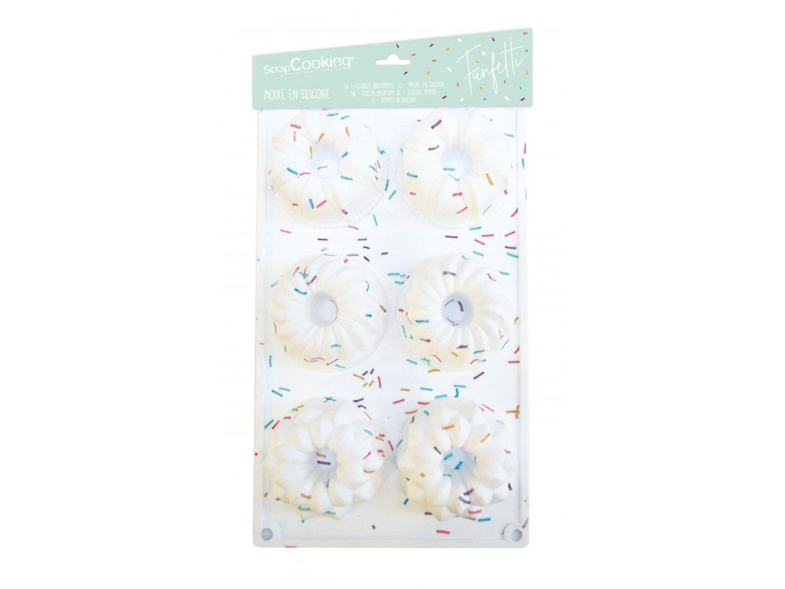 Siliconen mal om 6 mini kouglofs te maken. Geeft een originele vorm aan uw creaties, het gat in het midden stelt u in staat om te garneren met fruit of room, voor meer verwennerij! Funfetti = een nieuw assortiment siliconen mallen + fun!