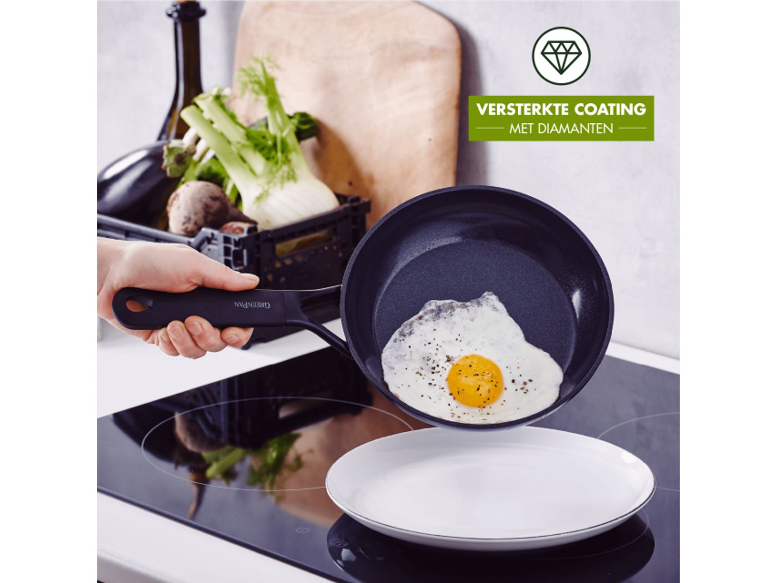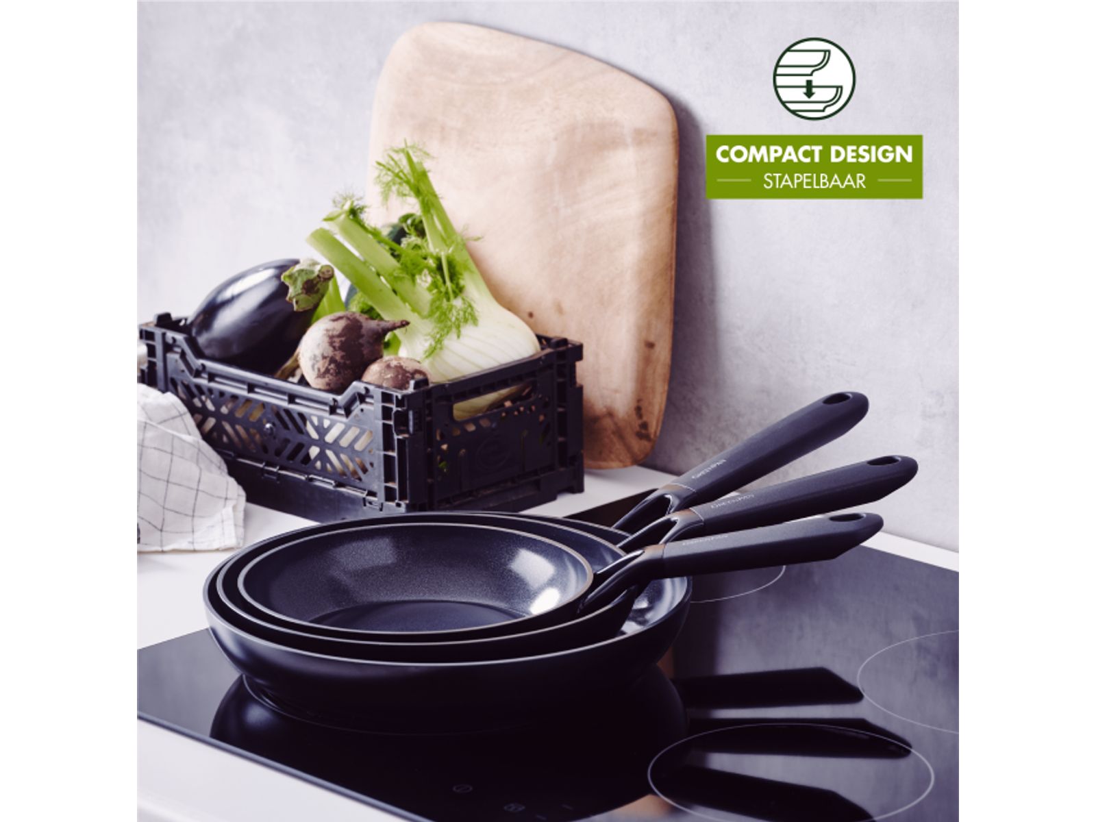 De Smart Collection is stapelbaar zodat je ze netjes en compact kan opbergen. Ze neemt maar liefst 30% minder plaats in in je keukenkast! De pannen hebben een Thermolon Infinity Pro keramische antikleeflaag die versterkt werd met diamant en geen schadelijke stoffen bevat (PFAS-vrij). De koele V-vormige handgreep zorgt ervoor dat je geen pannenlapjes nodig hebt om de pan veilig te verplaatsen en dankzij de naadloze binnenkant wordt afwassen makkelijker dan ooit!