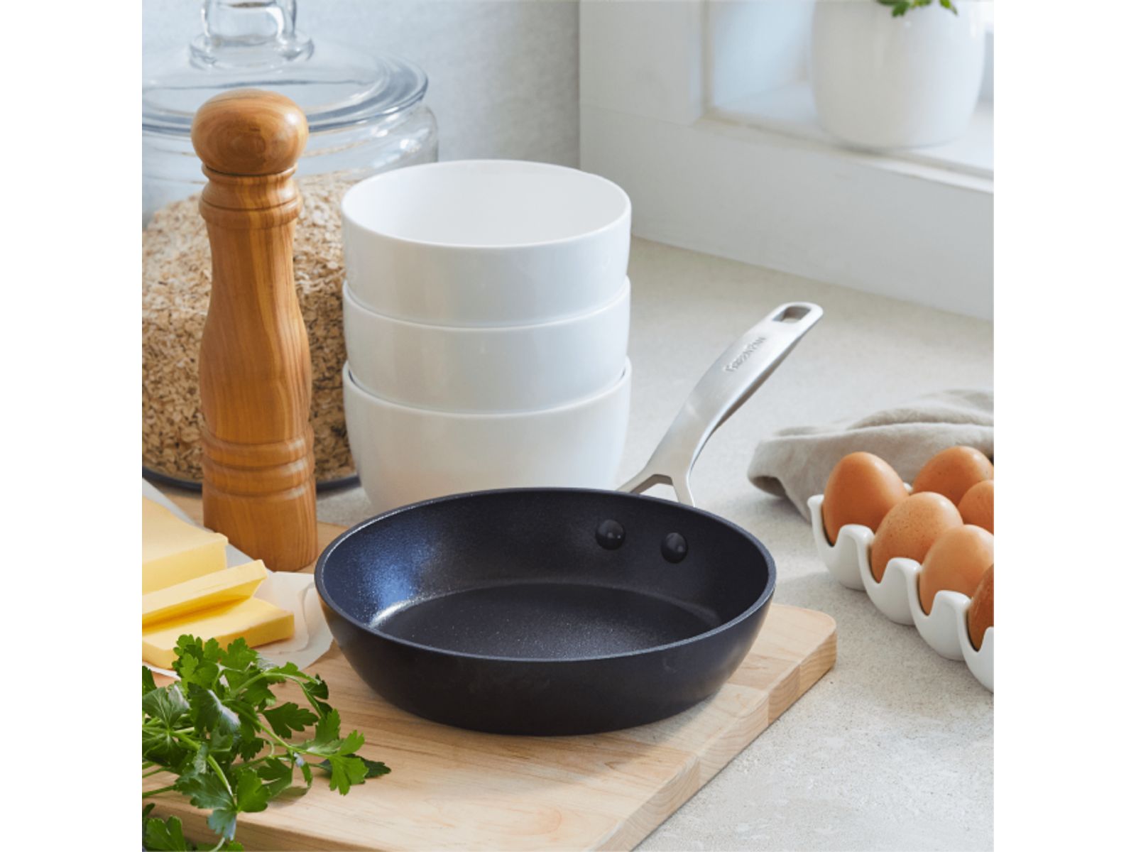De pannen uit de Copenhagen collectie hebben een extra groot bakoppervlak en zijn extreem duurzaam dankzij het gebruik van gehard aluminium. De Thermolon Infinity Pro keramische antikleeflaag is versterkt met diamant, warmt snel op en zorgt voor perfecte bakresultaten. Ze bevat geen schadelijke chemische stoffen (PFAS-vrij). Het strakke design en de matte roestvrijstalen handgrepen geven deze collectie een minimalistische look & feel.