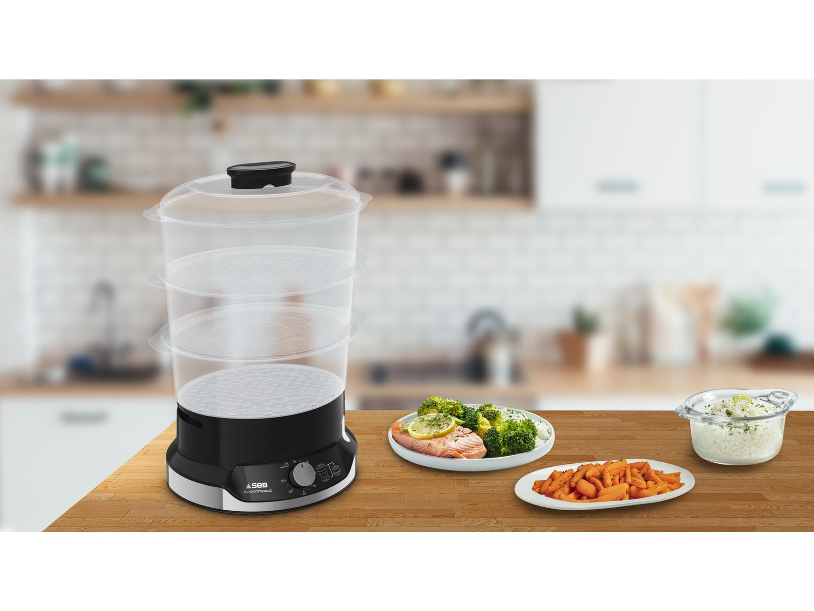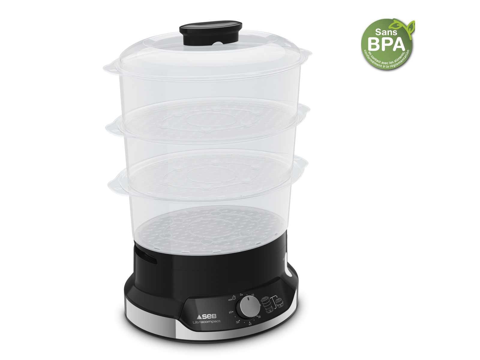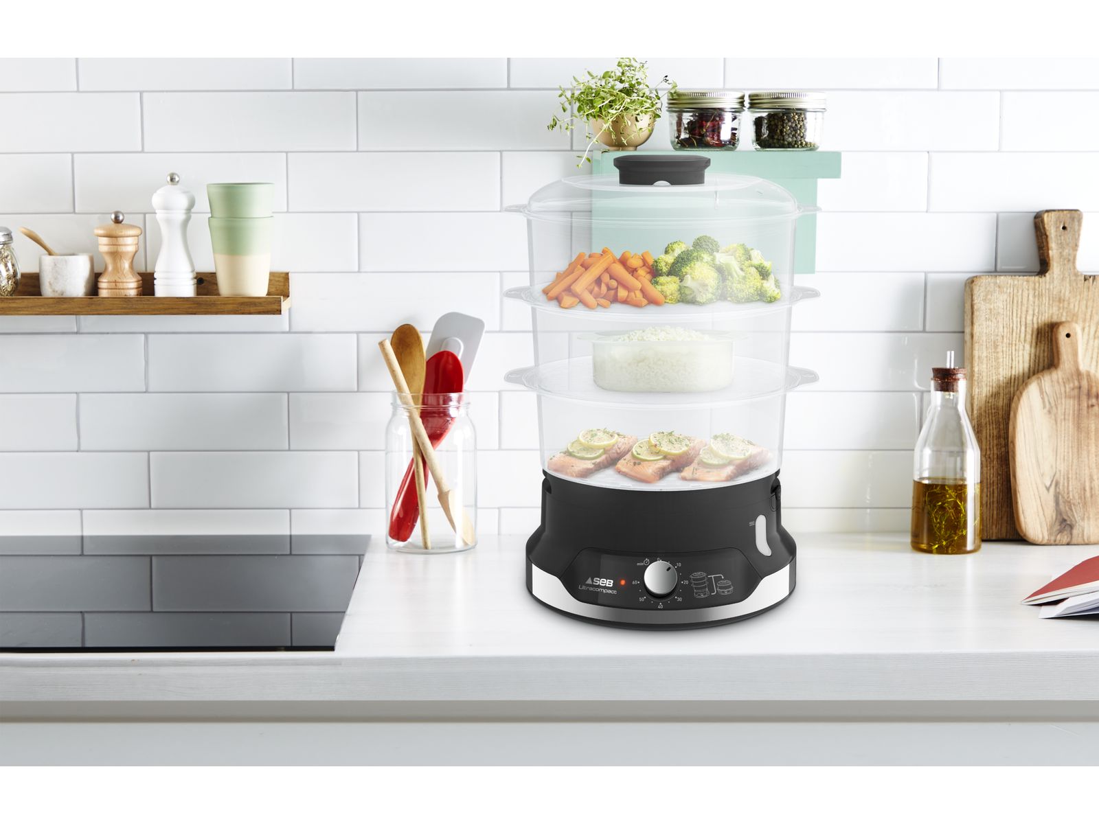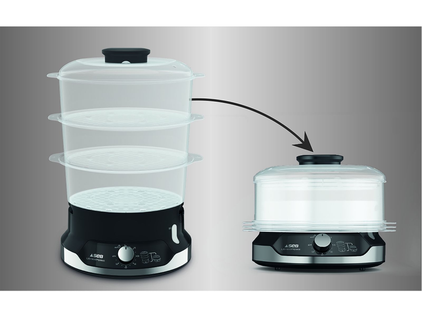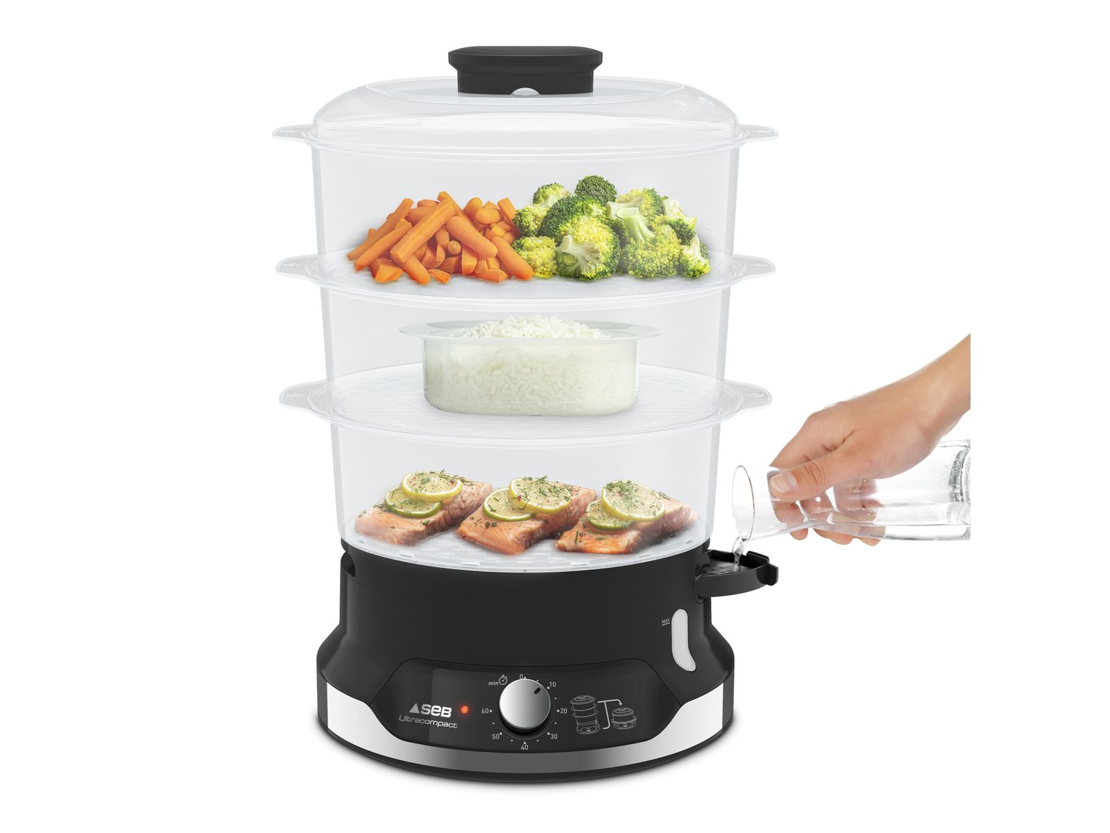 Met de Seb Ultracompact stoomkoker, een uiterst compact ontwerp voor totaal gebruiksgemak, bekomt u geheel eenvoudig en in een mum van tijd gezonde, smakelijke maaltijden. Het gepatenteerde stapelbare opbergsysteem is ruimtebesparend en past moeiteloos in elke keuken. En dankzij het 3-kommen meerlaagse kooksysteem op stoom kunt u voortaan verschillende ingrediënten op hetzelfde moment koken en tijd besparen.