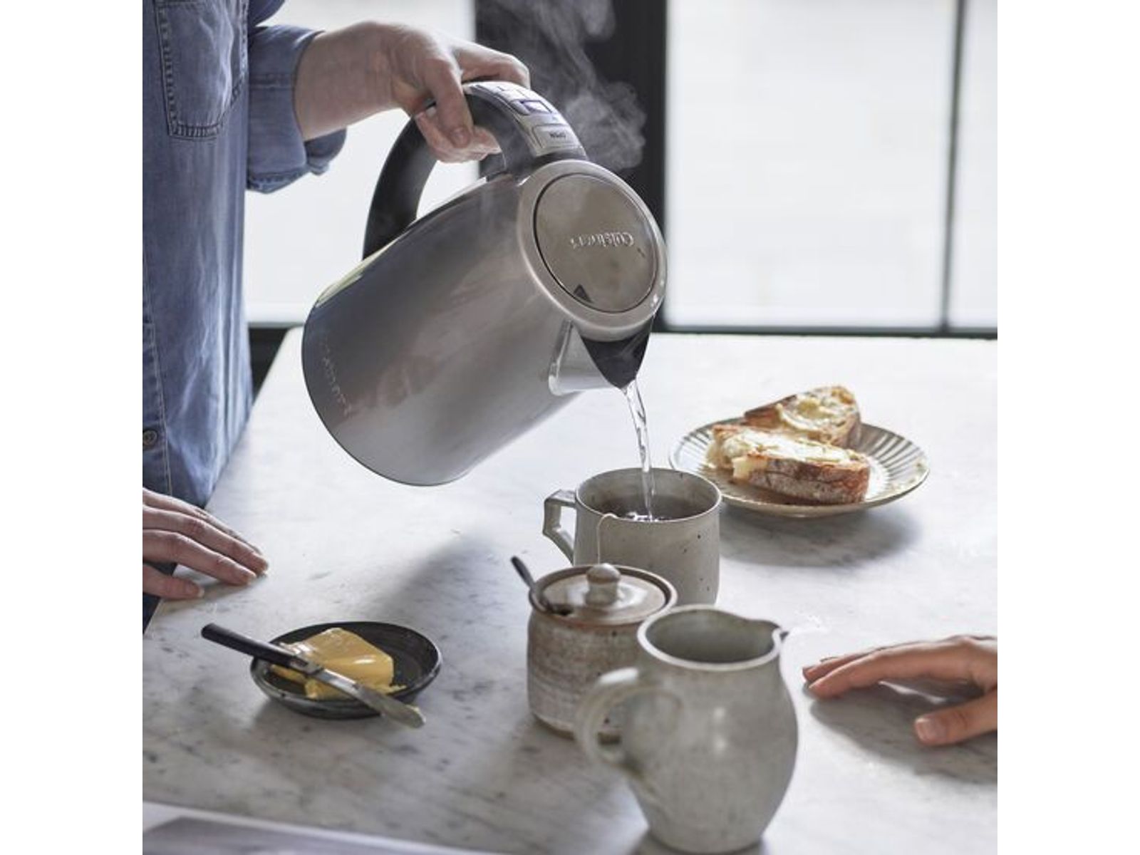 De waterkoker beschikt over meerdere temperatuuropties en met een vermogen van 3 kW kookt het water snel. Goed uitgebalanceerd voor comfortabele grip en uitschenken zonder morsen.