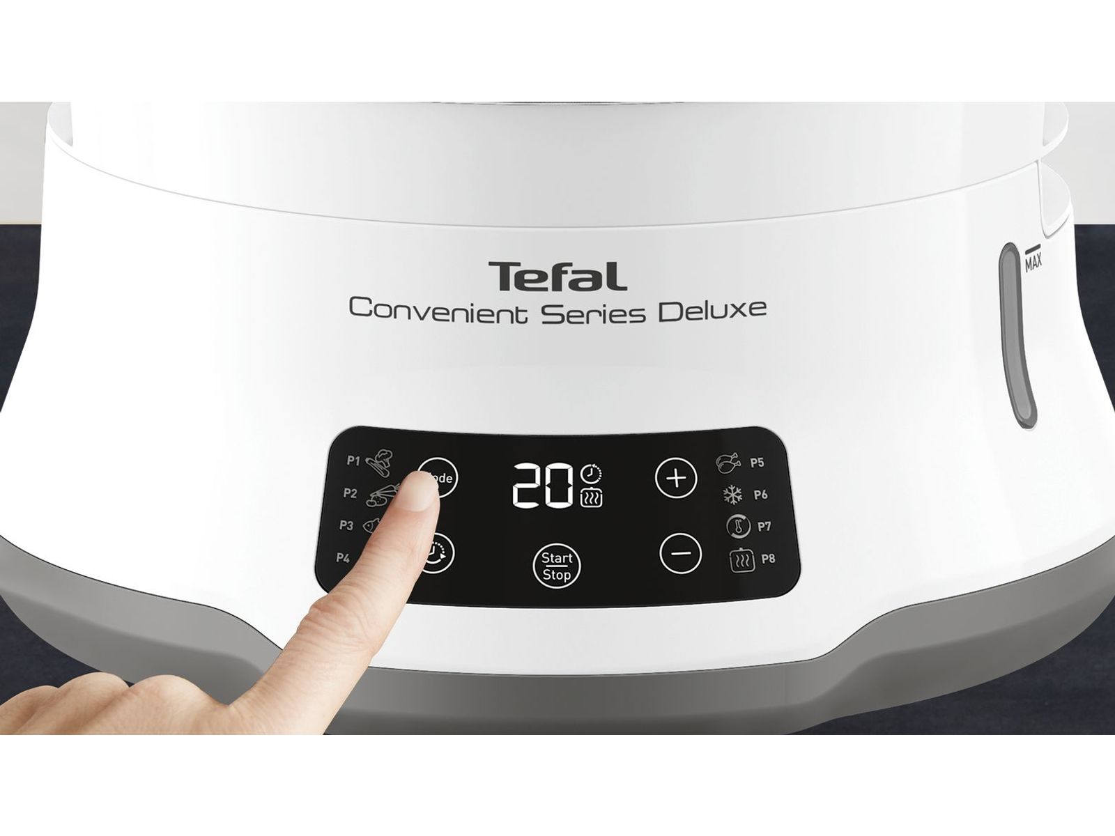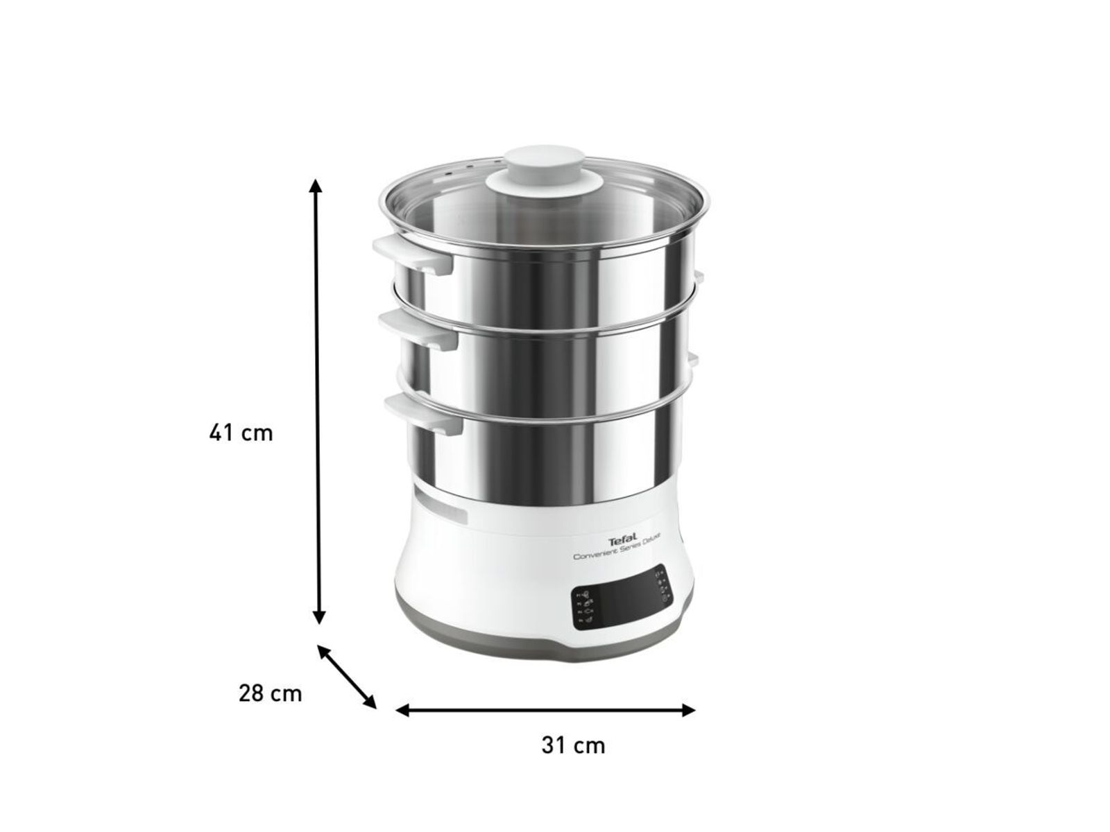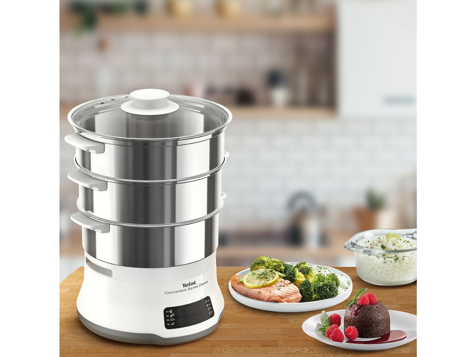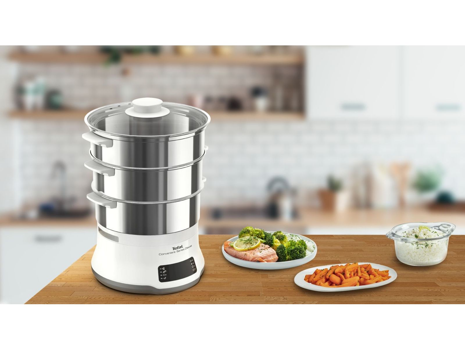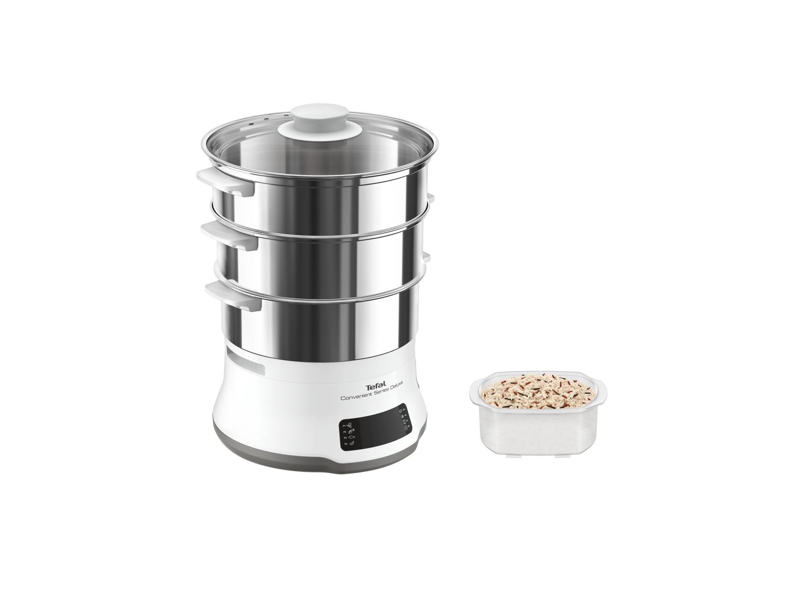 Met de Convenient Series Deluxe stoomkoker van Tefal, uitgerust met een gebruiksvriendelijk digitaal touch bedieningspaneel, voorzien van 8 bereidingsstanden kan je in een mum van tijd gezonde en smakelijke gerechten in eigen huis bereiden. Stoomkoken was nog nooit zo eenvoudig. Gestoomde gerechten waren nog nooit zo smakelijk. Deze stoomkoker, voorzien van kommen uit hoogwaardig rvs in een stapelbaar 3-laags design, plaatst gebruiksgemak een veelzijdigheid voorop. Met dit weldoordachte ontwerp, uitgerust met een hele reeks verbeterde functies, wordt koken op stoom een fluitje van een cent.
