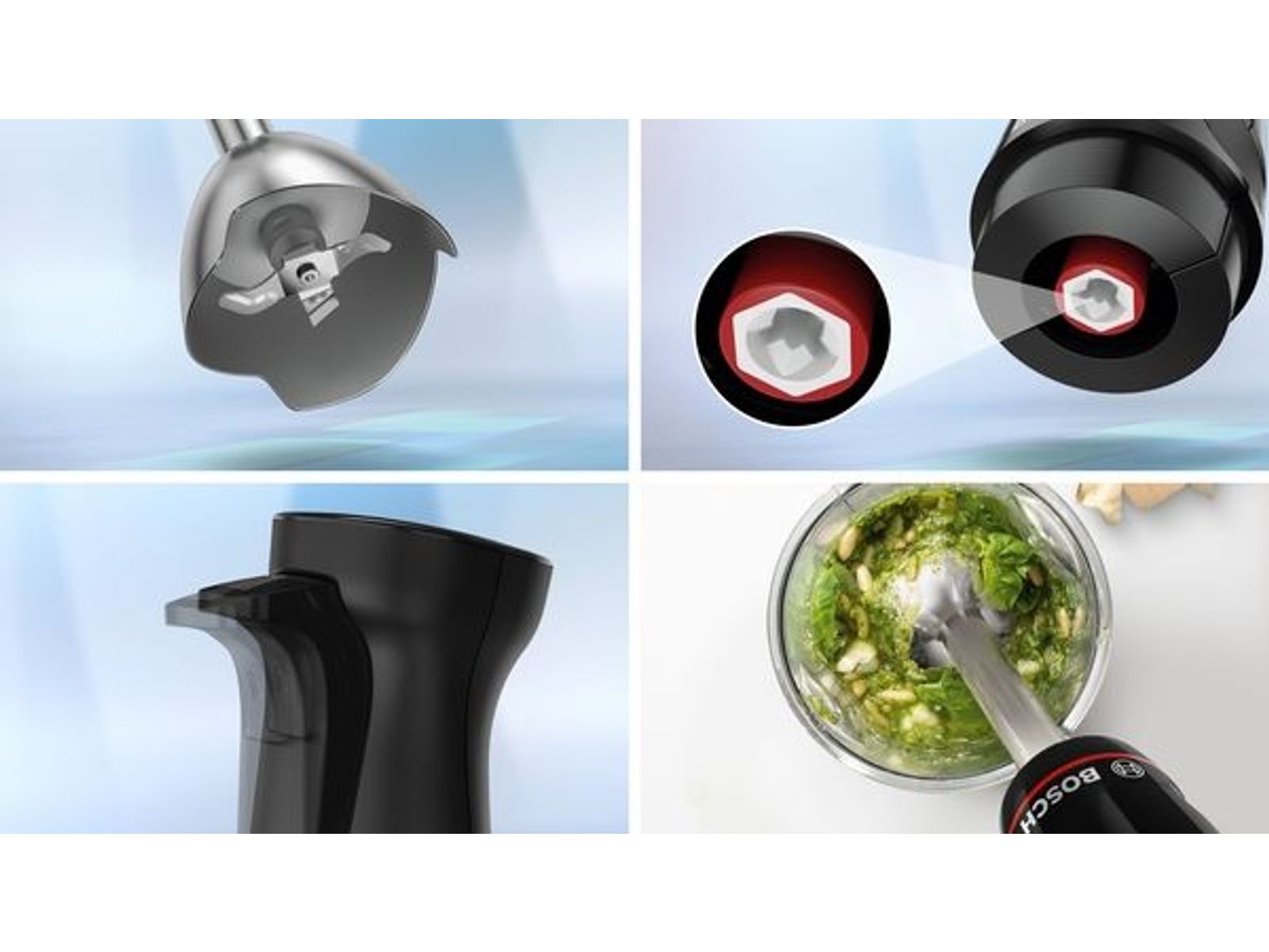 Geniet van een homogene gerechten textuur dankzij het QuattroBlade-mengsystem. De 4 extra scherpe inox messen garanderen uitstekende snijresultaten, een gelijkmatige consistentie en gemakkelijk mengen, zelfs met moeilijke ingrediënten. De belvorm vermindert spatten.