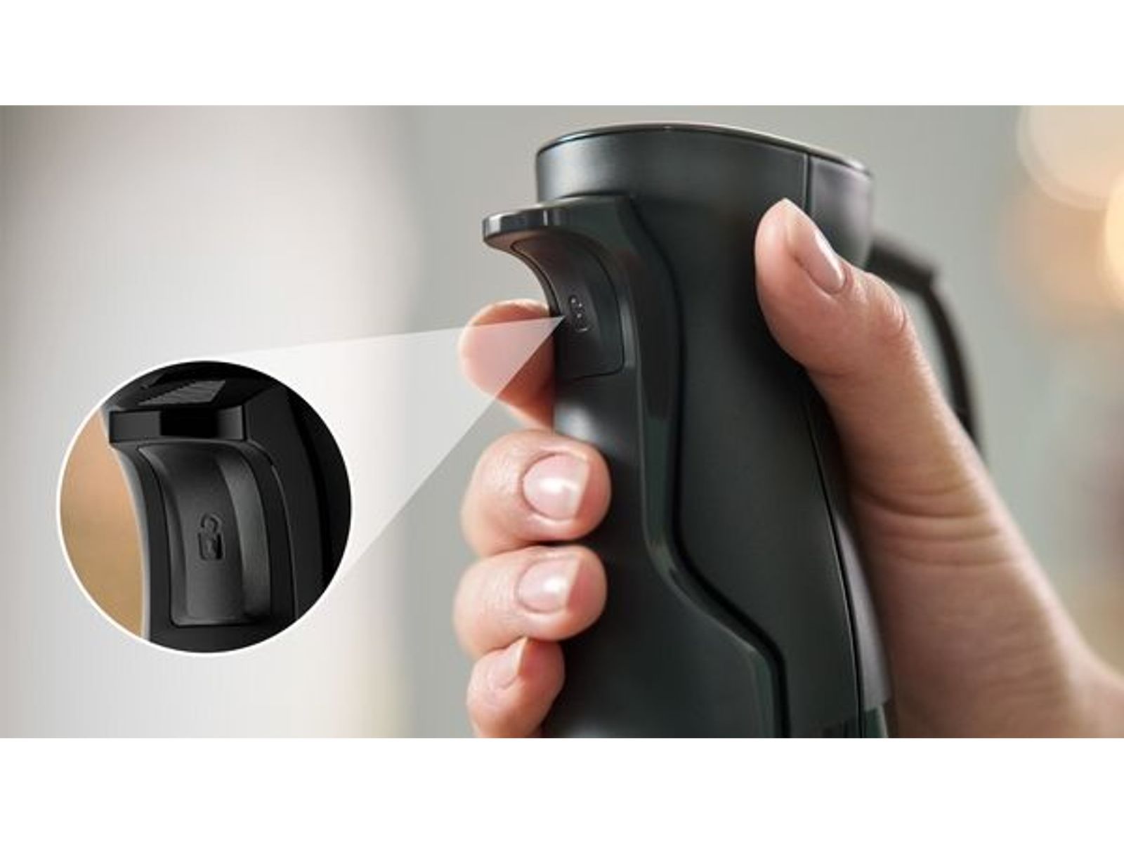 Bediening met één hand is nog nooit zo handig geweest: Hoe strakker je grip, hoe hoger de snelheid. Het is niet alleen gemakkelijk en intuïtief, maar ook comfortabel. De extra grote hendel is ontworpen voor gebruik met één hand. U kunt de snelheid volledig regelen met meerdere vingers of alleen de duim. Deze flexibiliteit maakt het zowel voor rechts- als linkshandigen gemakkelijk om de juiste snelheid in te stellen.