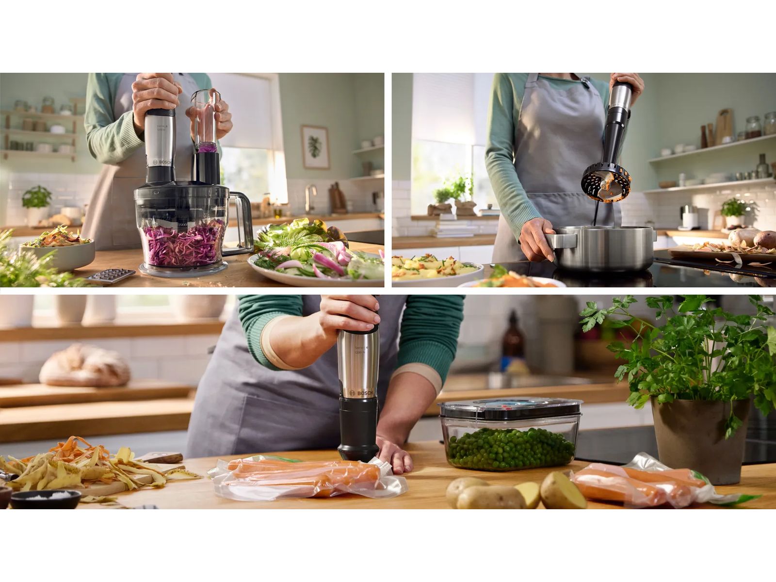 De ErgoMaster Serie 6 staafmixers maken je gerechten nog lekkerder: soepen worden lichter, spreads gladder. De krachtige motor, de speciaal gevormde bel en de 4 scherpe messen zorgen voor een perfecte textuur. Bereid je voor op een nieuw niveau van kookbeleving dankzij de grote snelheidsregeling, de stille werking en de ergonomische handgreep. De kracht van de luchtgekoelde, krachtige motor wordt zonder slijtage overgedragen op de messen. Tot slot kunt u gerust zijn, want het bevat alle knowhow van Bosch en heeft een onbreekbaar keramisch drijfwerk. Dit is een gepatenteerde wereldinnovatie.