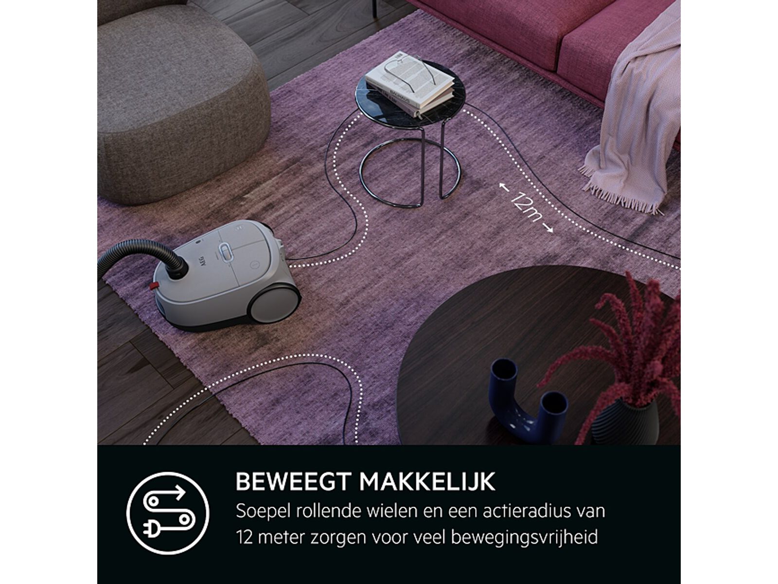 De handige wielen met rubberlaag garanderen vlotte bewegingen en dankzij de actieradius tot 12 meter kunnen verschillende ruimtes makkelijk worden bereikt. Je hoeft niet meer continu van stopcontact te wisselen.