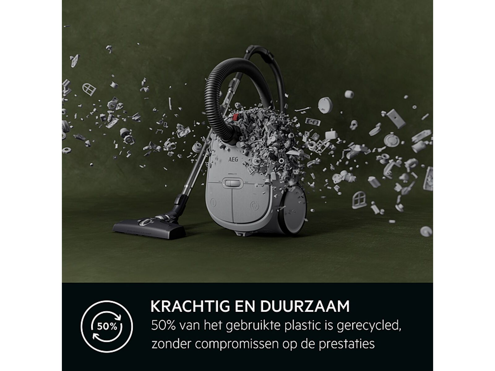 Krachtig en duurzaam. Gemaakt met 50% gerecycled kunststof