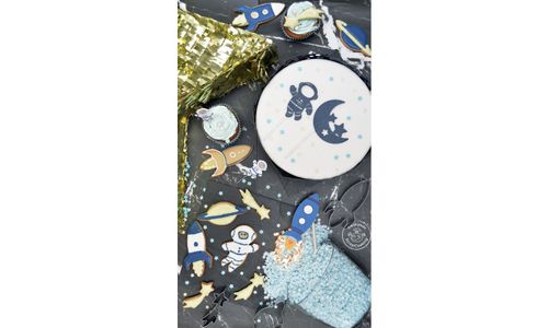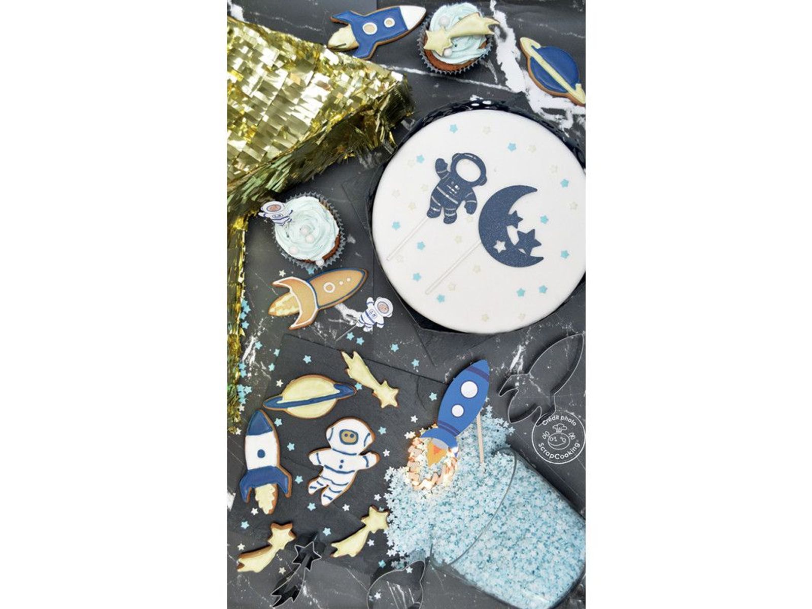 24 CAKE TOPPERS - Met 24 taarttoppers (12 raketten + 12 astronauten) om op je cupcakes te plakken. Kunststof plectrum geschikt voor contact met voedsel.
