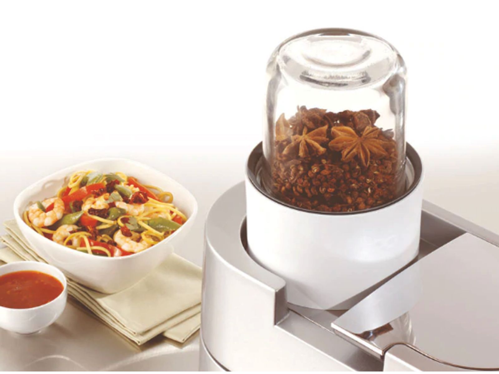Erg geschikt voor babyvoeding, kruiden, koffie, marinades, dressings,puree, kruiden en noten. De multimolen wordt geleverd met een set van drie voorraadpotjes met deksel, handig om de bereidingen in te bewaren.