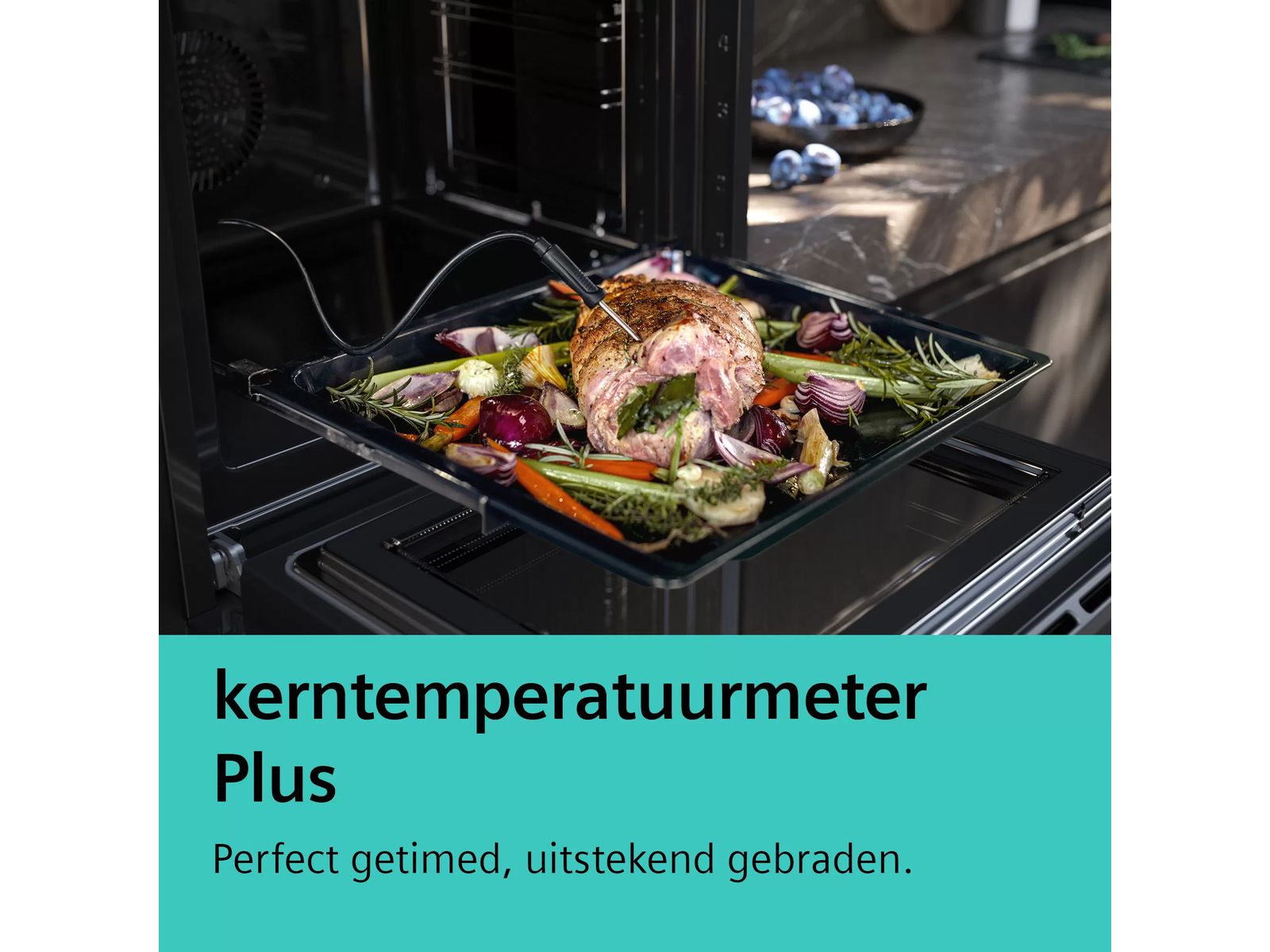 Ben je bezorgd dat je braadstuk in de oven niet perfect gaar is? Of je nu vlees, gevogelte of vis bereidt, de roastingSensor Plus meet de temperatuur op drie verschillende punten voor een hoge nauwkeurigheid. Dit garandeert perfecte resultaten en laat je het kookproces in de gaten houden. De Home Connect-app houdt je ook op de hoogte van de geschatte kooktijd voor een perfect mals en knapperig gebraad. Elke keer weer. Om te profiteren van deze functie verbind je simpelweg je oven met de Home Connect-app.