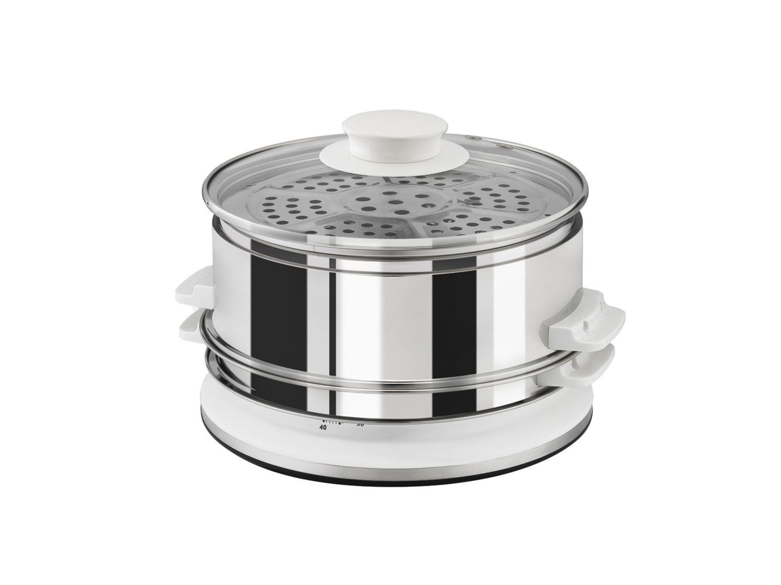 Stoomkoker met kom in roestvrij staal. Vermogen 900 W, capaciteit van de kommen: 6 liter, timer 60 min, zichtbaar waterpeil, toevoeging van water tijdens het koken,kommen in roestvrijstaal.