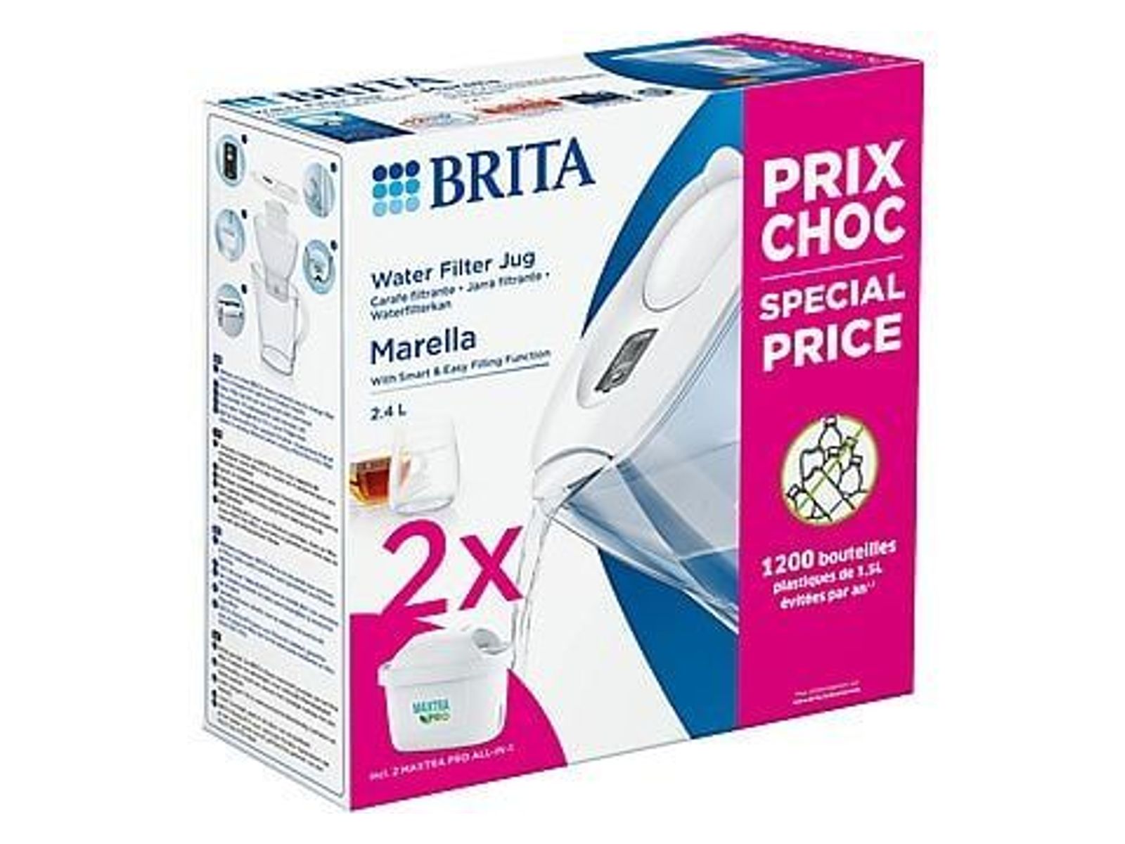 Een BRITA waterfilterkan voorziet je in een mum van tijd van heerlijk zacht drinkwater. Gewoon je kan vullen onder de kraan en BRITA filtert er de kalk en andere smaak- en geurverstorende stoffen uit. Ook je huishoudapparaten profiteren mee van dat zachte BRITA water: ontkalken is nauwelijks nog nodig. In de BRITA waterfilterkannen gebruik je de MAXTRA PRO filterpatronen, deze zijn goed voor 4 weken of 150 liter heerlijk gefilterd water. Vervang ze tijdig en geniet zo altijd van perfect gefilterd water. Doe nu je voordeel met deze BRITA waterfilterbundel, hij bestaat uit 2 MAXTRA PRO ALL-IN-1 waterfilterpatronen (goed voor 2 maanden heerlijk gefilterd water) en een Marella Cool waterfilterkan met een deksel met handige vulklep en een elektronische Memo die het ideale vervangingsmoment aangeeft zodat je exact weet wanneer het waterfilterpatroon aan vervanging toe is, past in de deur van de koelkast en is vaatwasmachinebestendig (behalve het deksel cfr. Memo).