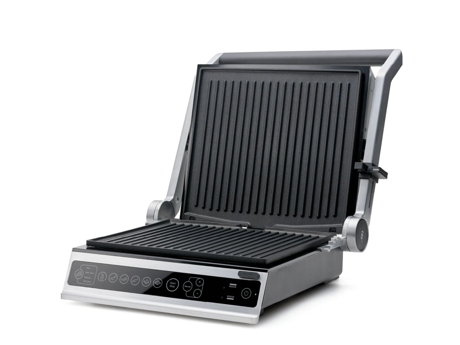 De Contact Grill Pro is je veelzijdige keukenhulp voor onbeperkte grillmogelijkheden en meer. Het unieke 180° openingsontwerp stelt je in staat om de temperatuur van beide grillplaten individueel aan te passen, wat elke keer perfecte resultaten garandeert. Het intuïtieve touch control-paneel maakt bediening moeiteloos en is ook eenvoudig schoon te maken. Met een verscheidenheid aan automatische grillprogramma's - van steak tot kip tot vis - past deze multifunctionele grill zich perfect aan je kookbehoeften aan. Geribbelde grillplaten inbegrepen.
