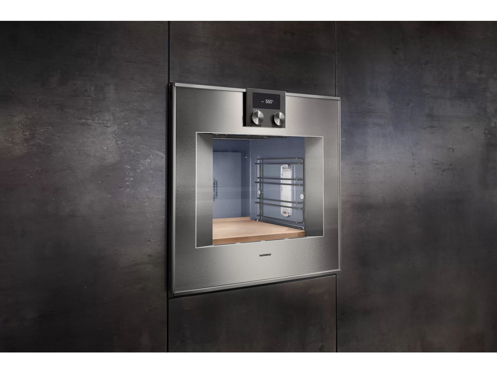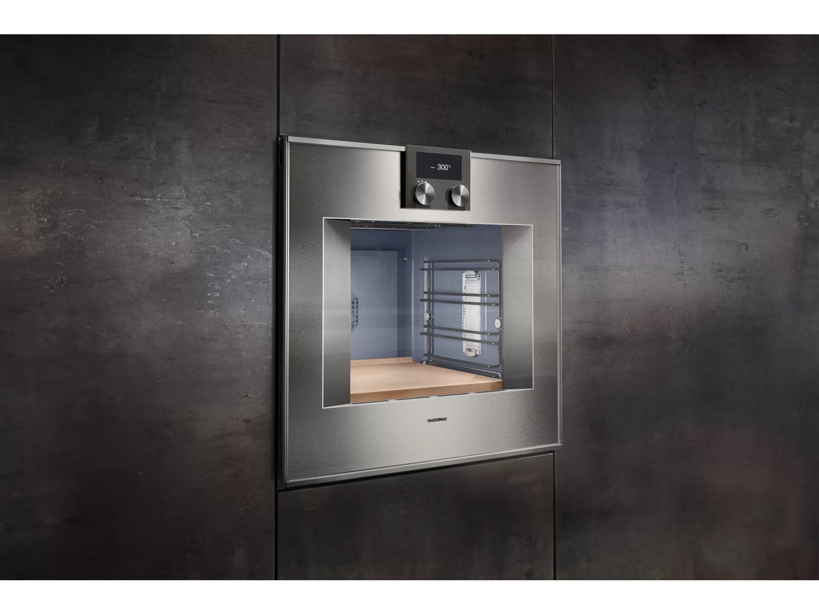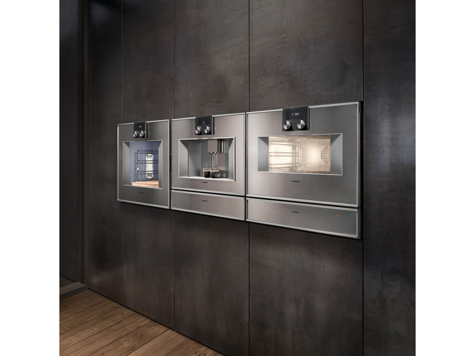 Het karakteristieke uiterlijk van Gaggenau wordt gekenmerkt door de volledig glazen deur die iets uitsteekt. Druk op het TFT-Touchdisplay om de greeploze deur de complete 180 °C te openen.