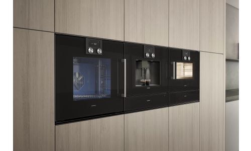Het karakteristieke uiterlijk van Gaggenau, vlak ingewerkt, nodigt uit om aan de handgreep te trekken en de deur de volle 110 °C te openen.
