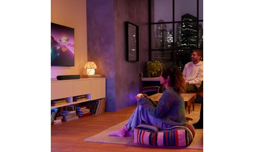 Laat je omringen door elk verhaal, elke game en ieder nummer met surround sound ondersteund door een compacte en veelzijdige soundbar en twee achterspeakers.