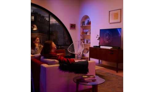 Laat je omringen door elk verhaal, elke game en ieder nummer met surround sound ondersteund door een compacte en veelzijdige soundbar en twee achterspeakers.