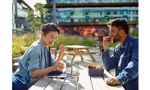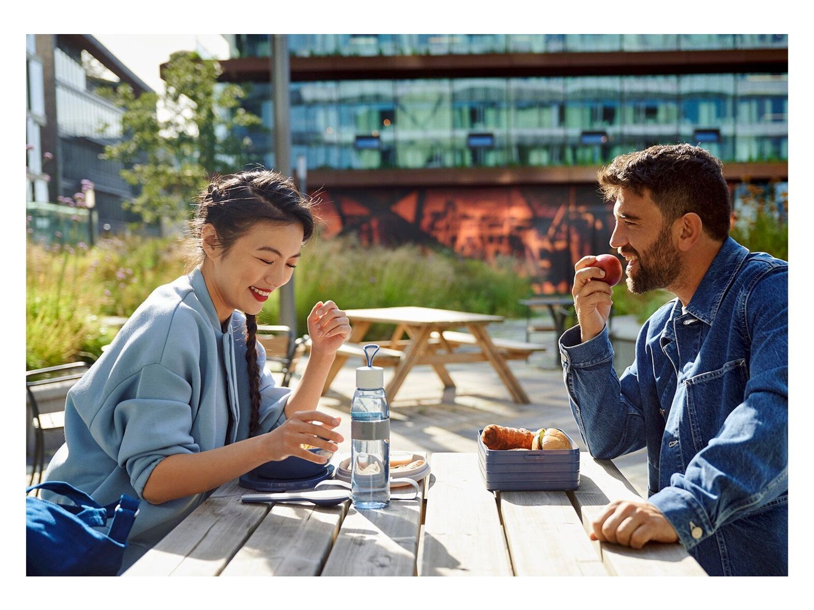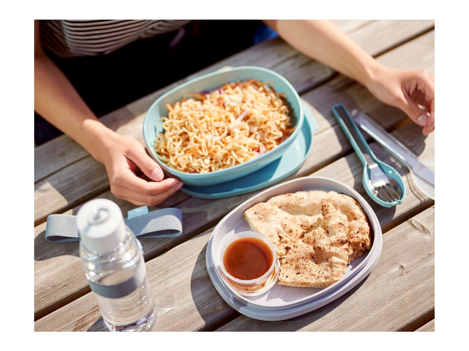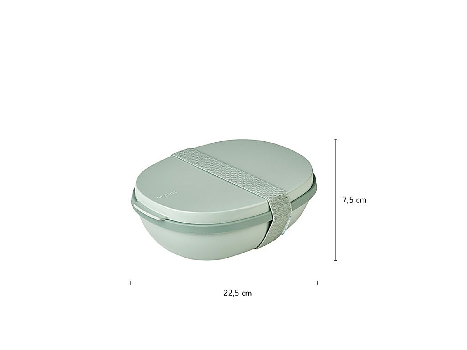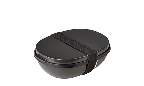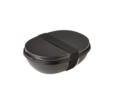 Lunchbox Ellipse duo in de kleur Nordic black. Deze stijlvolle en stevige zwarte lunchbox past perfect in een gezonde levensstijl. Groot genoeg voor boterhammen en lekkere salades, maar ook voor het opwarmen van een complete maaltijd met rijst of pasta. De Ellipse duo mag namelijk - zonder het compartiment - in de magnetron! In het royale compartiment kun je brood, tomaatjes of mueslirepen vervoeren en er is genoeg plek voor bestek. Dressings, croutons of pijnboompitjes neem je mee in de meegeleverde minibox en na gebruik mag de Ellipse lunchbox gewoon in de vaatwasser (zonder elastiek). Een fraaie decoratieve band maakt de Ellipse duo helemaal compleet!