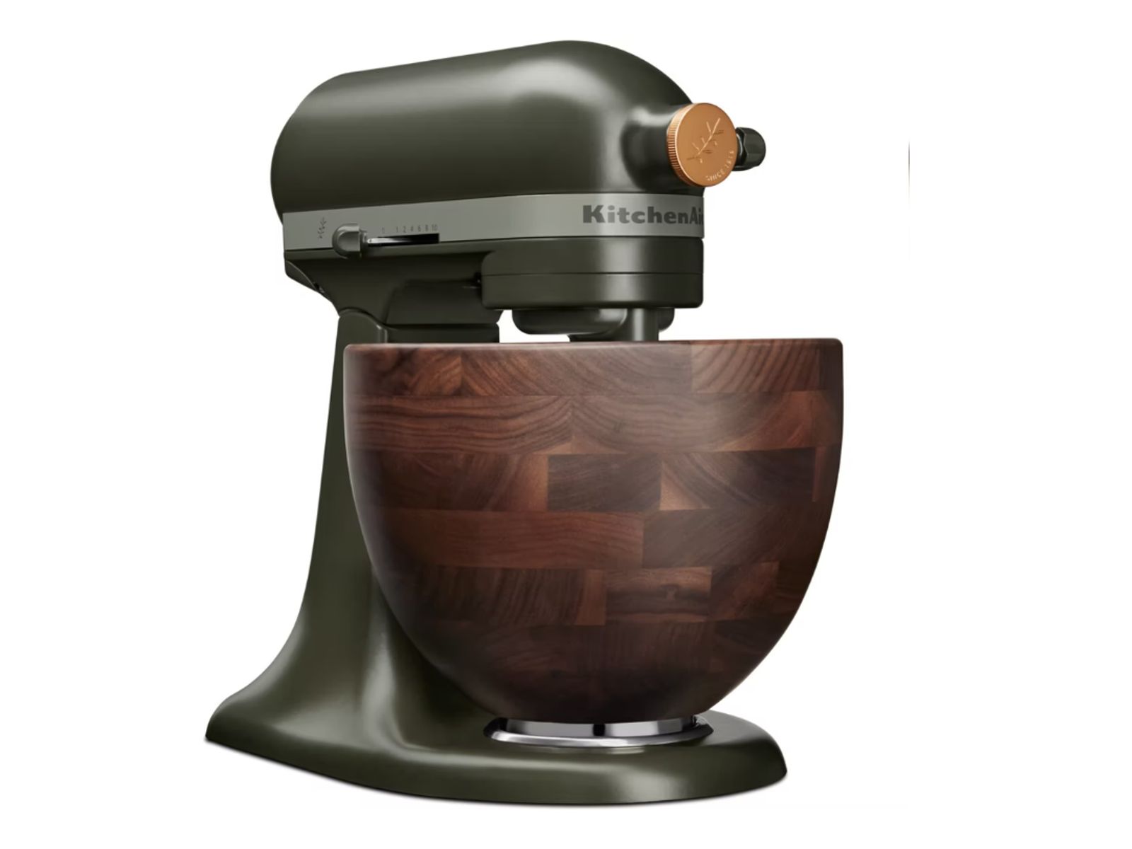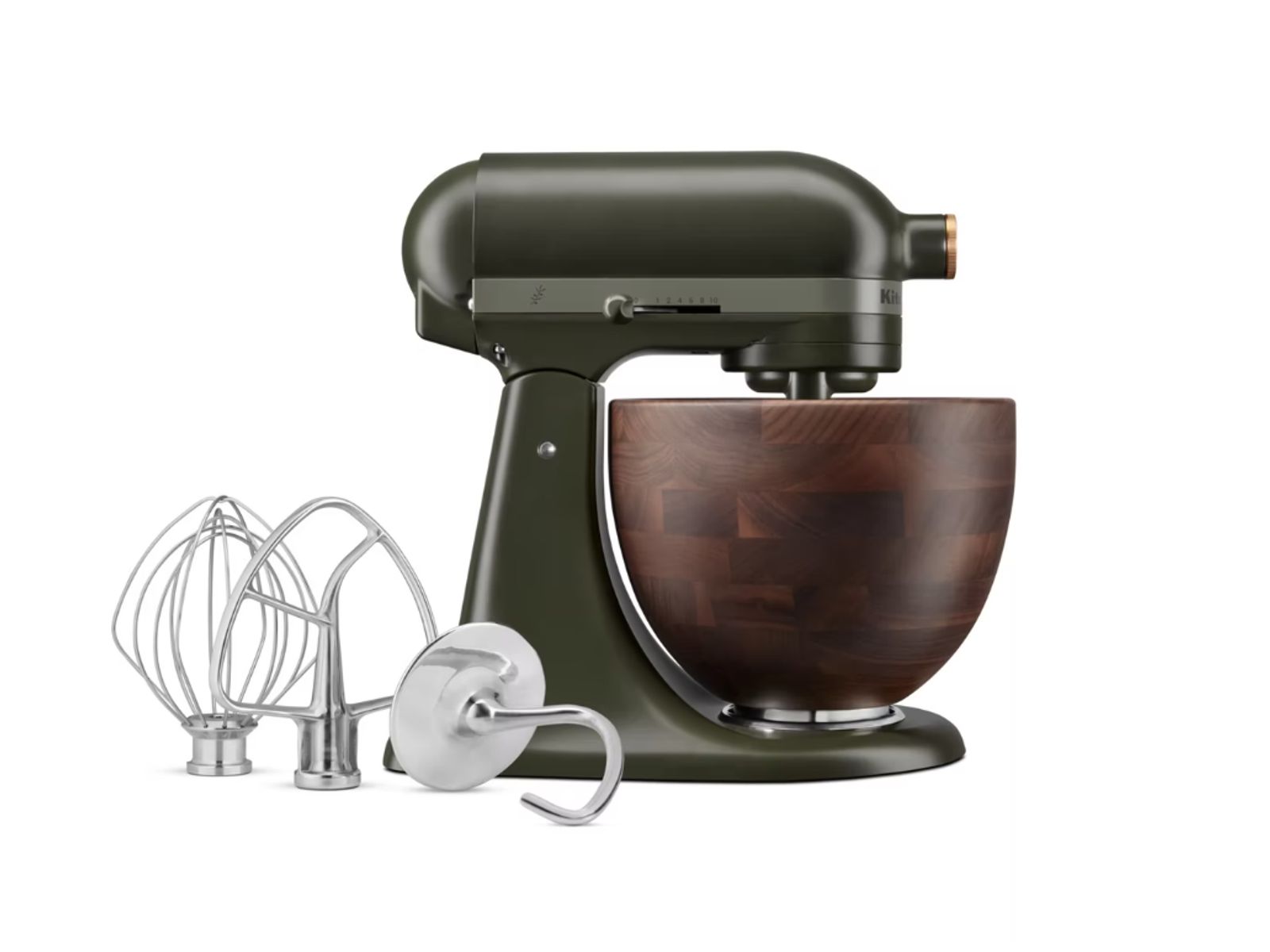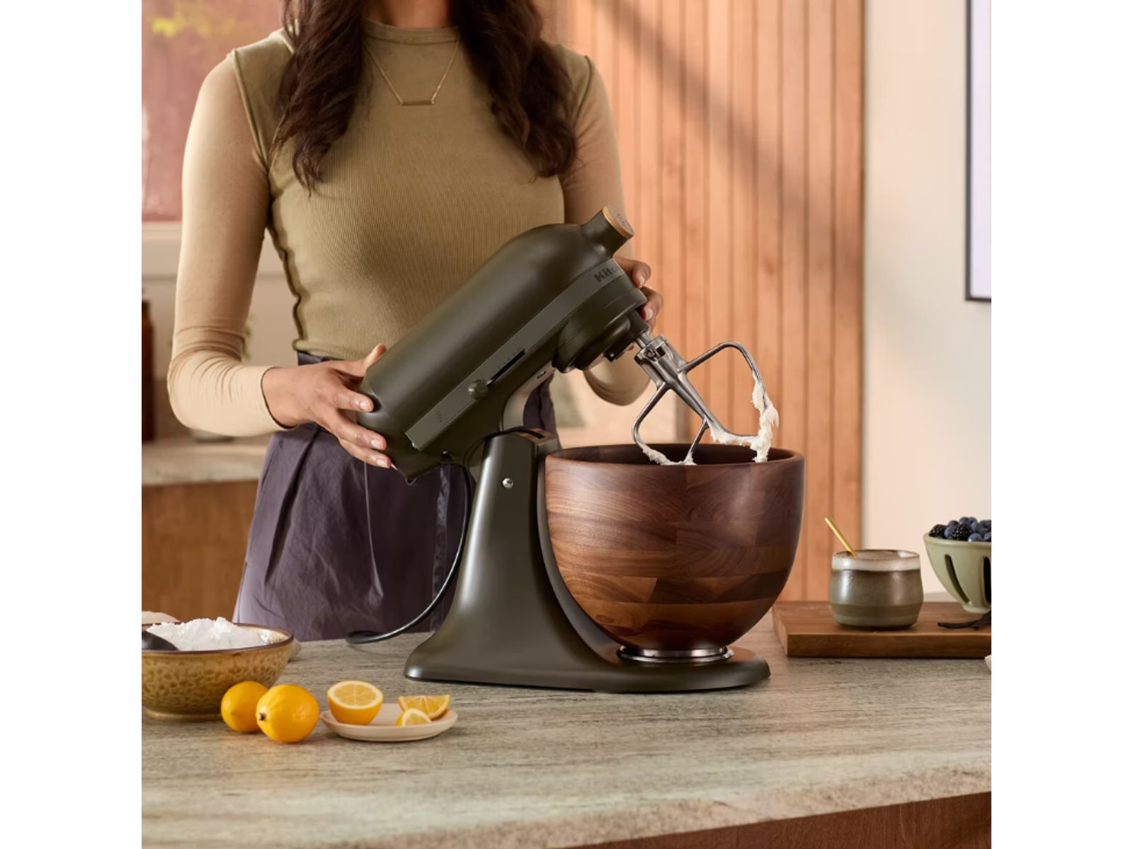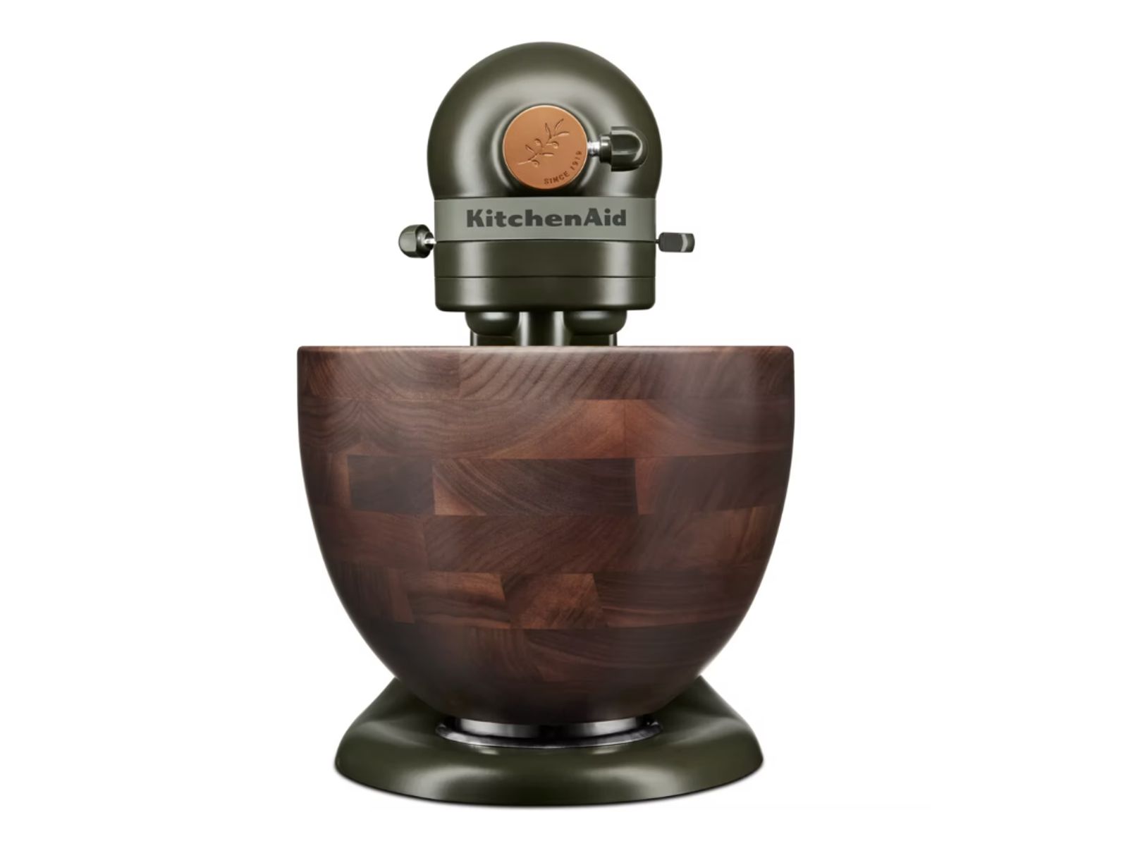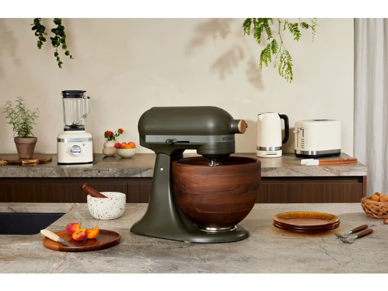 Nieuw in die serie is de KitchenAid Evergreen Mixer met kantelbare kop. Hij heeft een diepgroene kleur en een kom van echt walnoothout. Net als een heerlijk fris briesje brengt deze mixer de essentie van de natuur naar je keuken, waarbij je moet denken aan de rijke kleuren van een prachtig, groen bos.