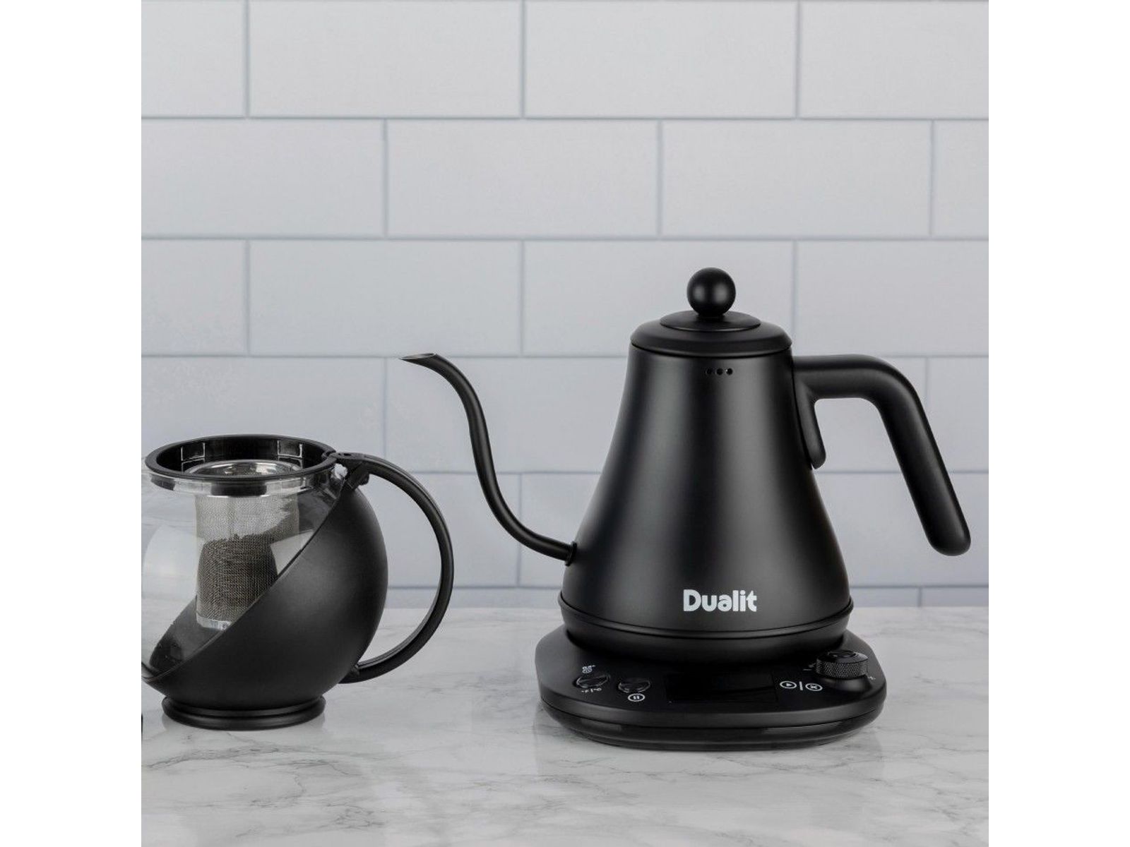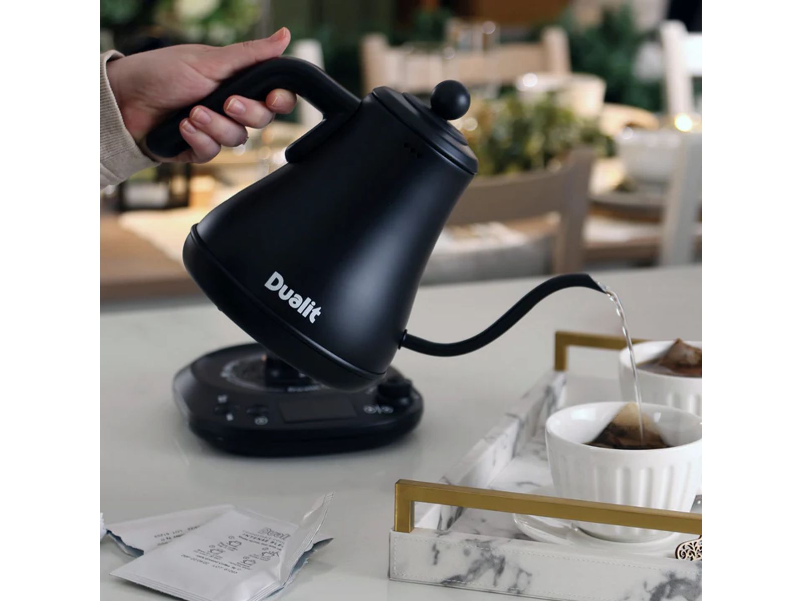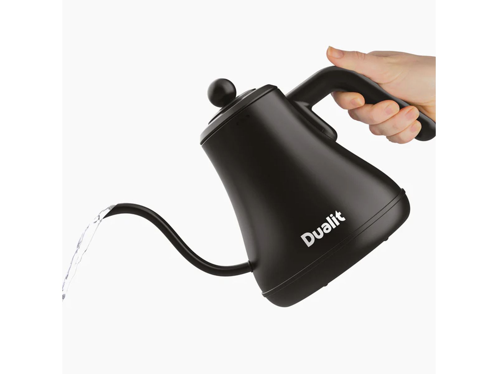 Dualit's Pour Over Kettle Black is ideaal voor het handmatig zetten van koffie met de pour-over techniek, of voor wanneer je een precieze temperatuur nodig hebt. De precieze schenktuit zorgt voor een gelijkmatige stroom aan heet water bij het zetten van koffie en daarmee voor een consistente en langzame extractie. Op deze manier wordt het maximale aan smaak en aroma onttrokken. De Pour Over Kettle biedt een beter bereik dan traditionele waterkokers, dankzij de lange en gebogen zwanenhalsuitloop. De temperatuurregeling kan met één graad tegelijk worden ingesteld van 38°C tot 100°C. De Dualit waterkoker biedt ook een warmhoudfunctie om de geselecteerde temperatuur gedurende vijf minuten vast te houden.