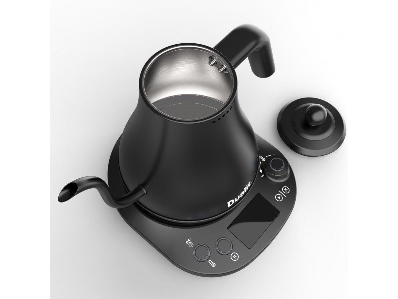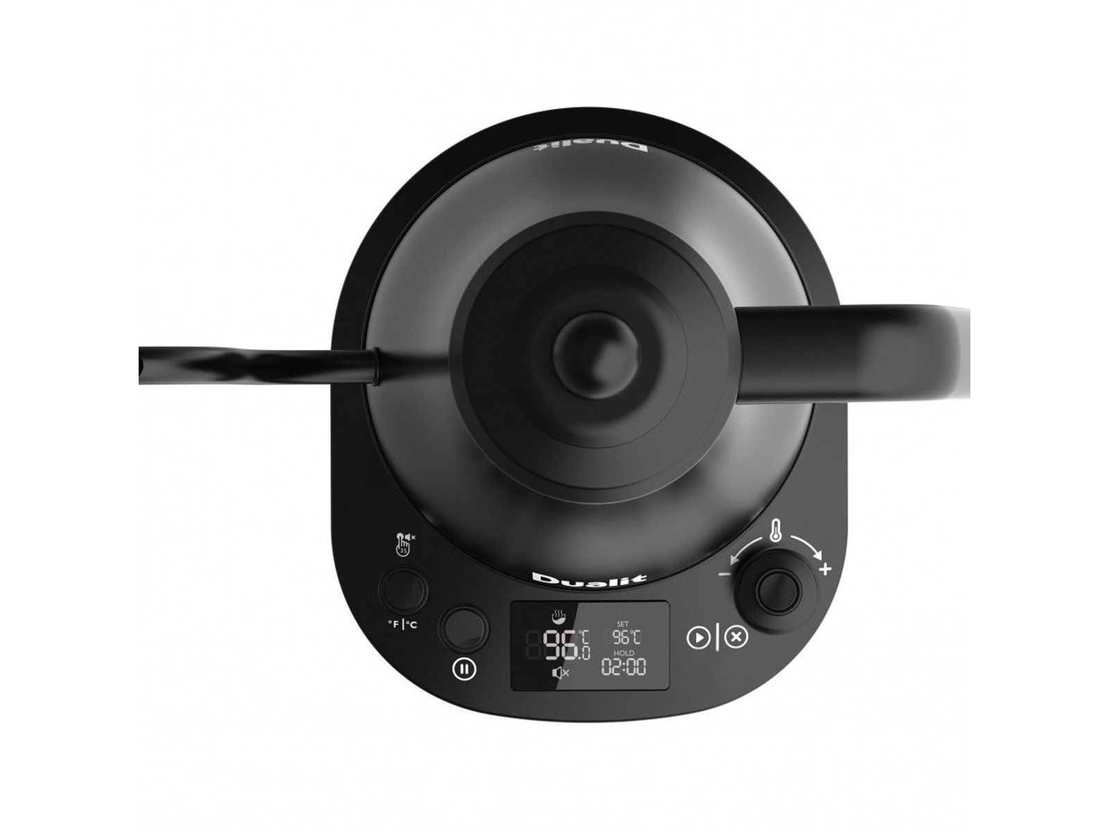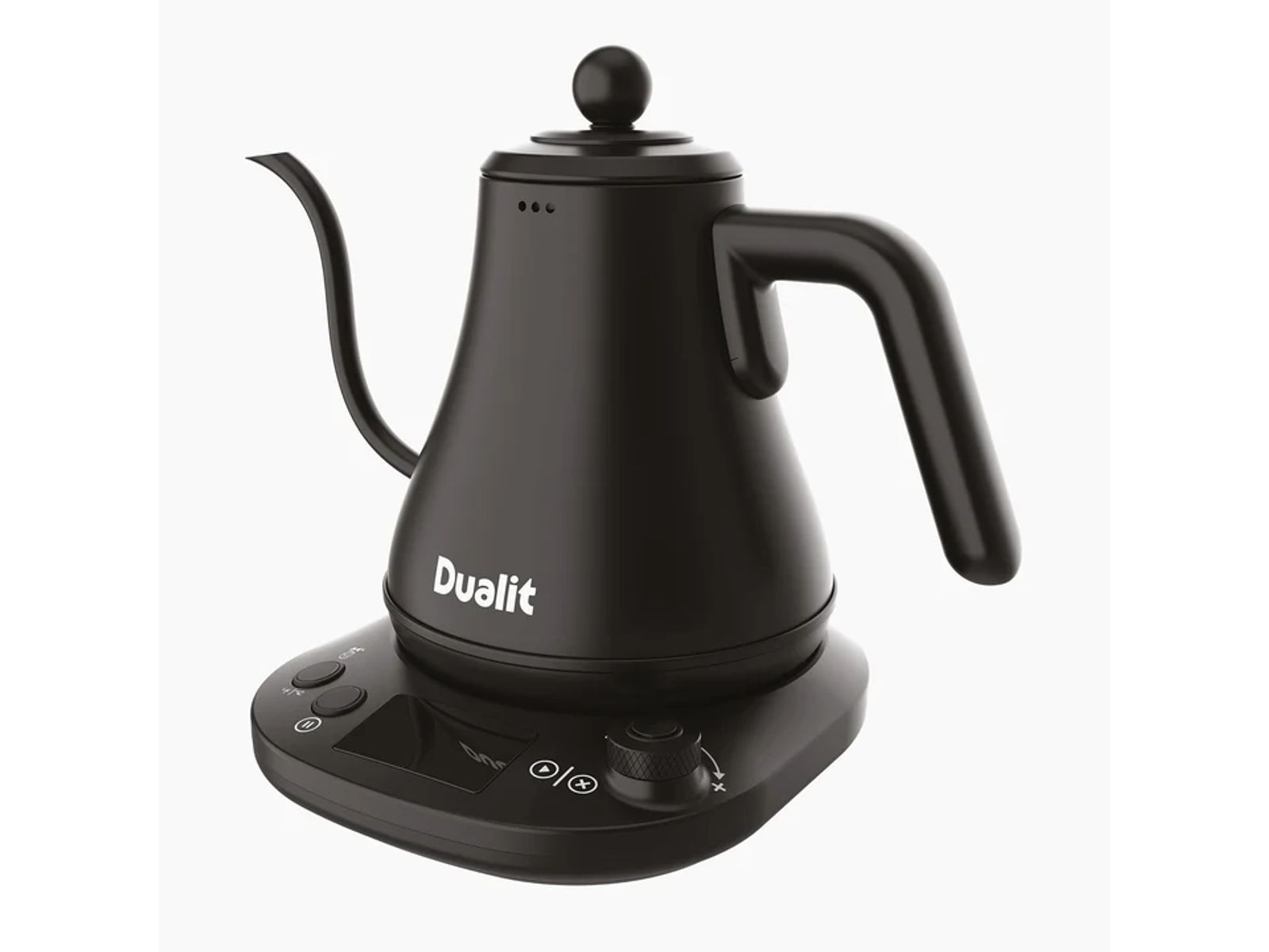 Dualit's Pour Over Kettle Black is ideaal voor het handmatig zetten van koffie met de pour-over techniek, of voor wanneer je een precieze temperatuur nodig hebt. De precieze schenktuit zorgt voor een gelijkmatige stroom aan heet water bij het zetten van koffie en daarmee voor een consistente en langzame extractie. Op deze manier wordt het maximale aan smaak en aroma onttrokken. De Pour Over Kettle biedt een beter bereik dan traditionele waterkokers, dankzij de lange en gebogen zwanenhalsuitloop. De temperatuurregeling kan met één graad tegelijk worden ingesteld van 38°C tot 100°C. De Dualit waterkoker biedt ook een warmhoudfunctie om de geselecteerde temperatuur gedurende vijf minuten vast te houden.