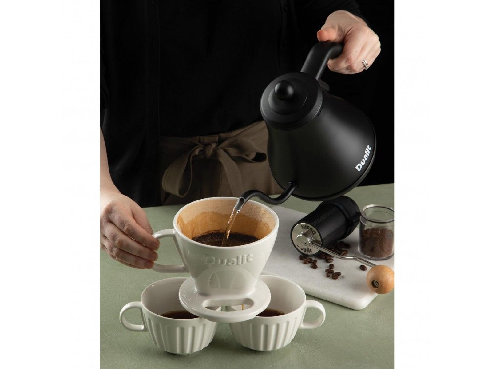 Met de dunne zwanenhalsuitloop kan je langzaam en nauwkeurig schenken. Bij het zetten van koffie zorgt dit telkens weer voor een maximale extractie van smaak en aroma. Water heeft de neiging om te snel uit een traditionele waterkoker te gutsen om over koffie te schenken, dus Dualit's Pour Over Kettle is ideaal om dit tegen te gaan. Het water stroomt langzaam door en verzadigt de hele koffiemaling, wat leidt tot een uitzonderlijke extractie.