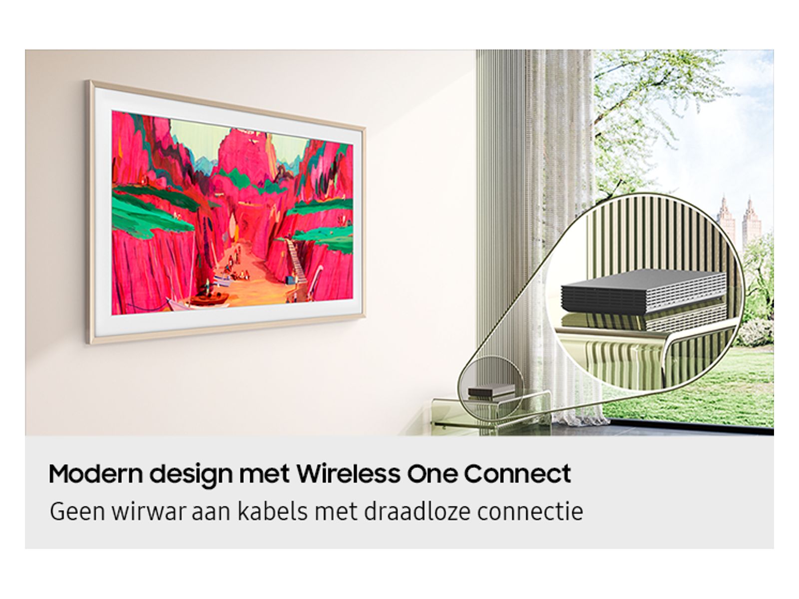 Minimaliseer je interieur met een omnidirectionele draadloze oplossing. Plug je apparaten in de Wireless One Connect. Signalen worden moeiteloos verstuurd vanuit elke hoek verstuurd naar The Frame Pro, zelfs op maximaal 10 meter afstand van de TV.1