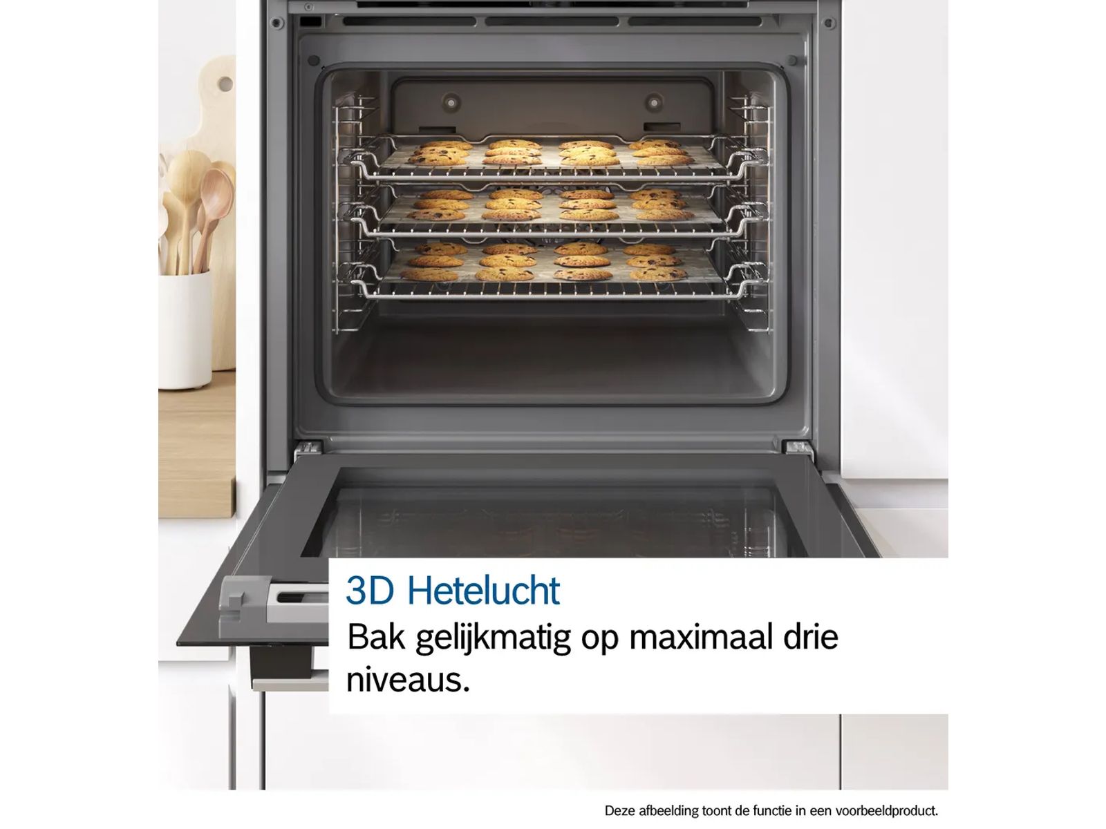 Nu kun je tal van lekkernijen, zoals koekjes, op maximaal drie niveaus tegelijk bakken. De ventilator van 3D warme lucht verdeelt de warmte snel en gelijkmatig door de ovenruimte. Je kunt ook drie gerechten tegelijk bereiden in één oven. Zo bak je lasagne voor de lunch, gebraad voor het diner en muffins voor het dessert allemaal samen, zonder dat de smaken zich mengen.
