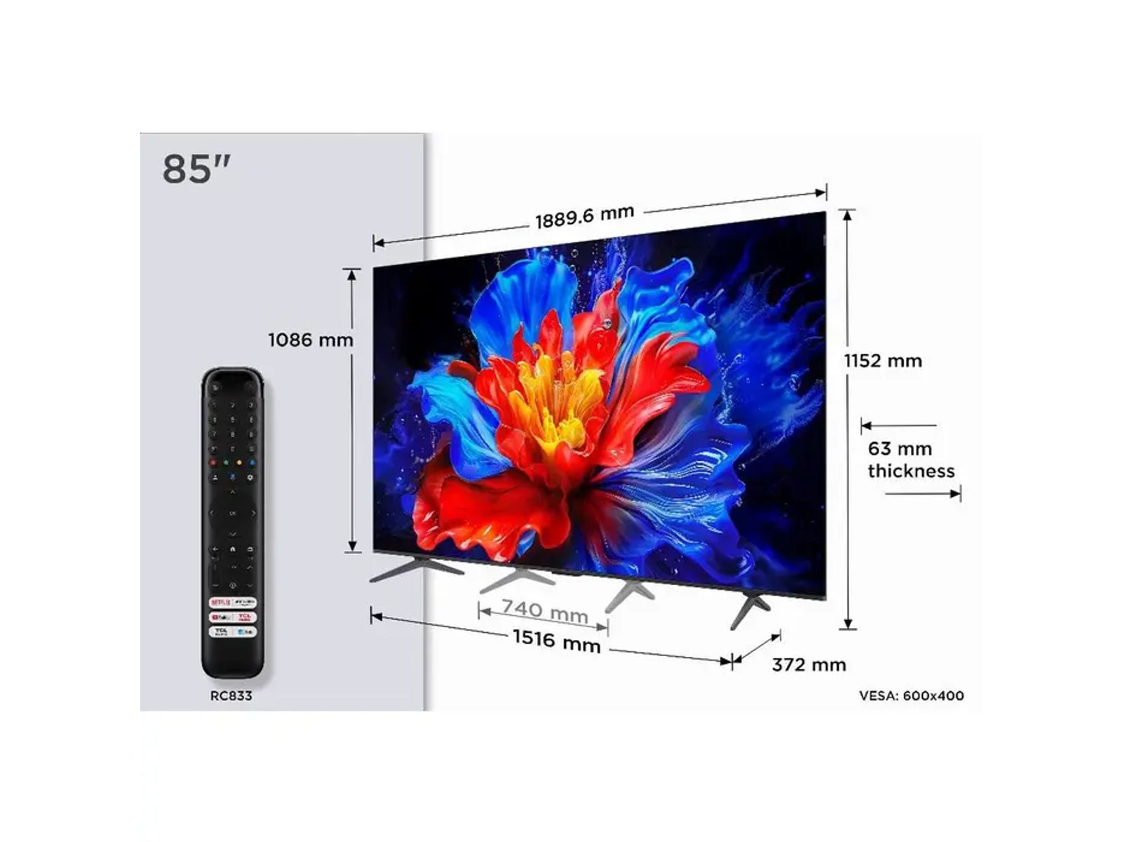 Elegant en slim: het bezel-less luxe ontwerp van de TCL P8K Serie wordt geleverd met een verstelbare 2-standen standard*** waarmee je een TCL-soundbar kunt plaatsen of deze grote scherm-tv op een kleinere oppervlakte thuis kunt neerzetten.