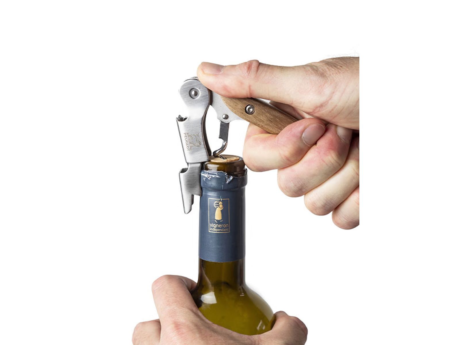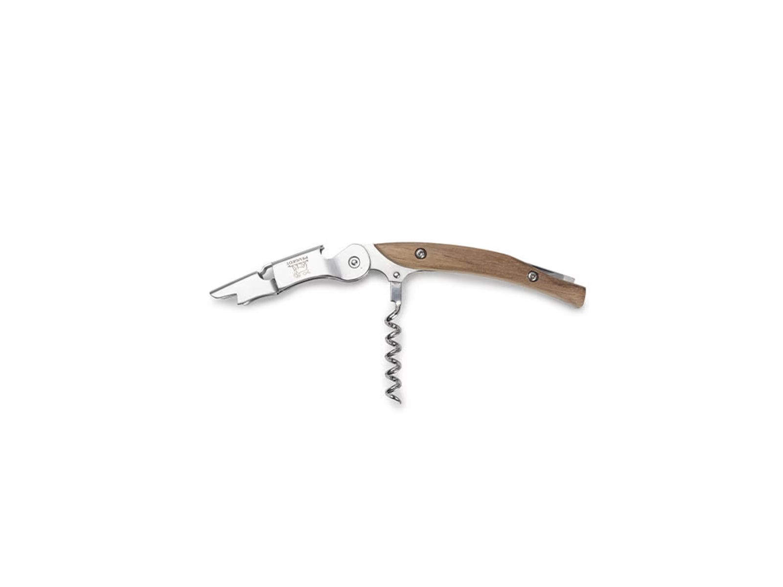 Het zorgvuldig gevormde handvat van walnoothout geeft dit elegante accessoire een warme en authentieke uitstraling. Elk stuk is uniek, met verschillende nerven die het edele karakter van de houtsoort benadrukken. Compact en ergonomisch ligt deze kurkentrekker perfect in de hand en past hij gemakkelijk in een zak of een schort.